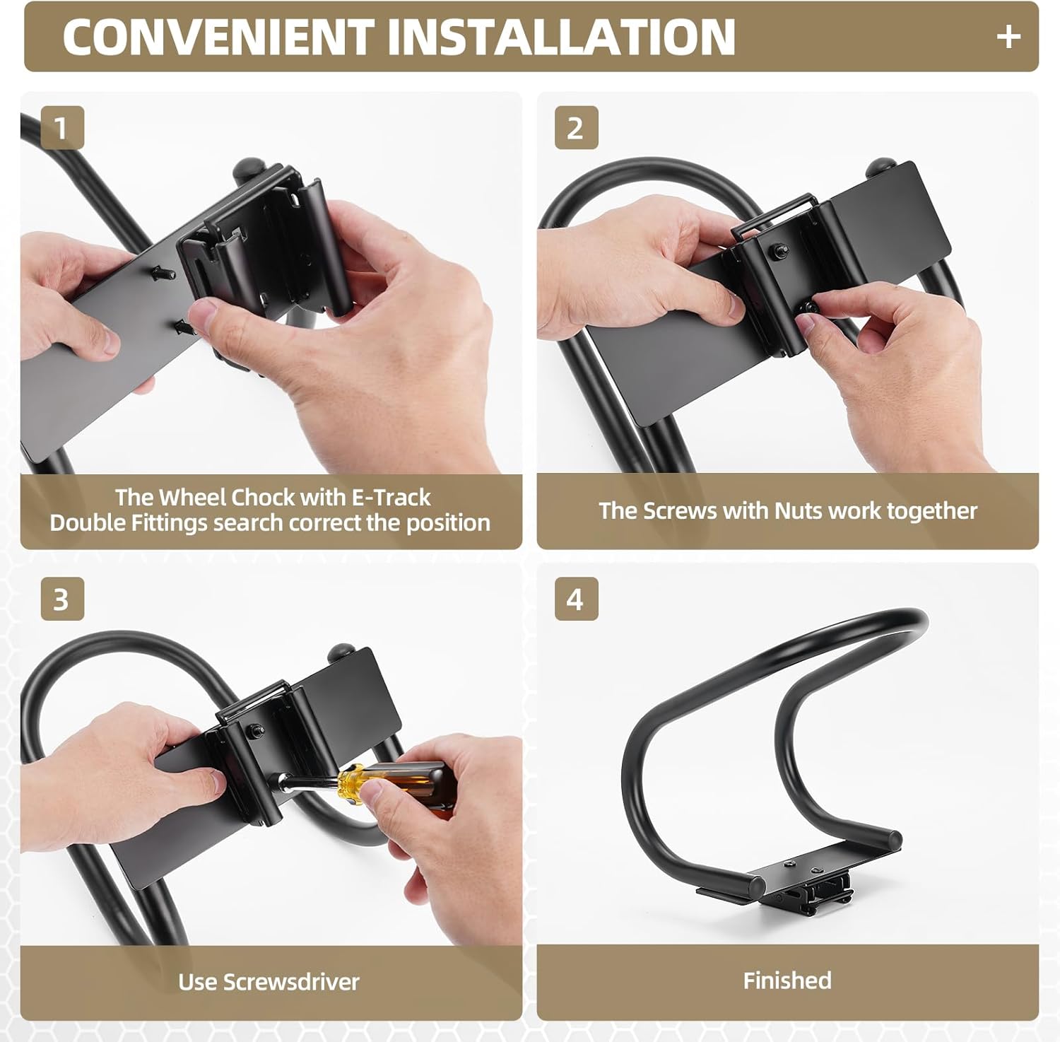 - Application:Our motorcycle wheel chock is incredibly easy to install. Simply clip it into the E-track rail slots, and you're good to go. Use the E-track wheel chocks to securely mount your motorcycle, dirt bike, or any other bike to the E-Track rails. Enjoy a hassle-free and secure way to transport your bikes with our reliable motorcycle chocks.