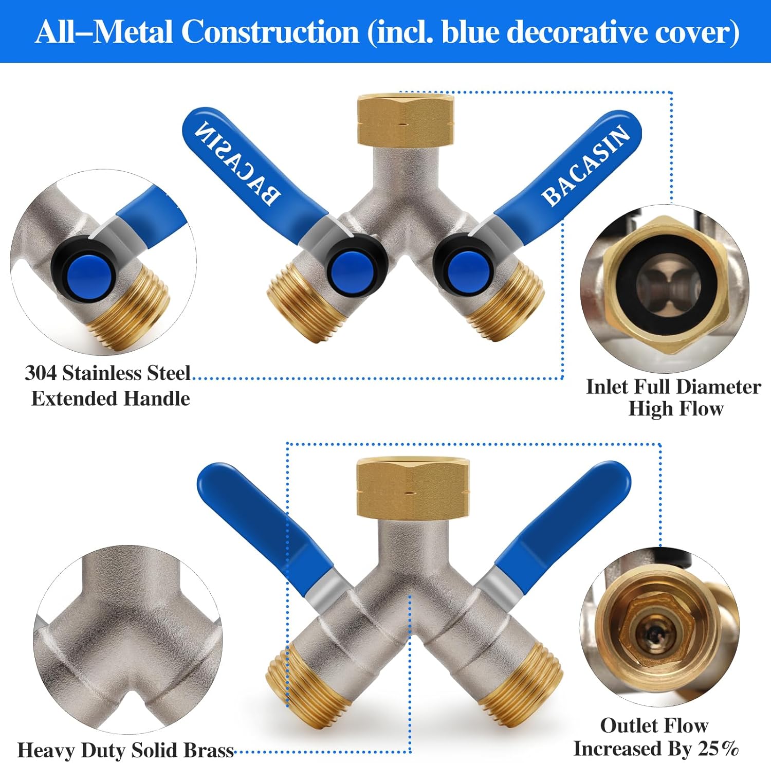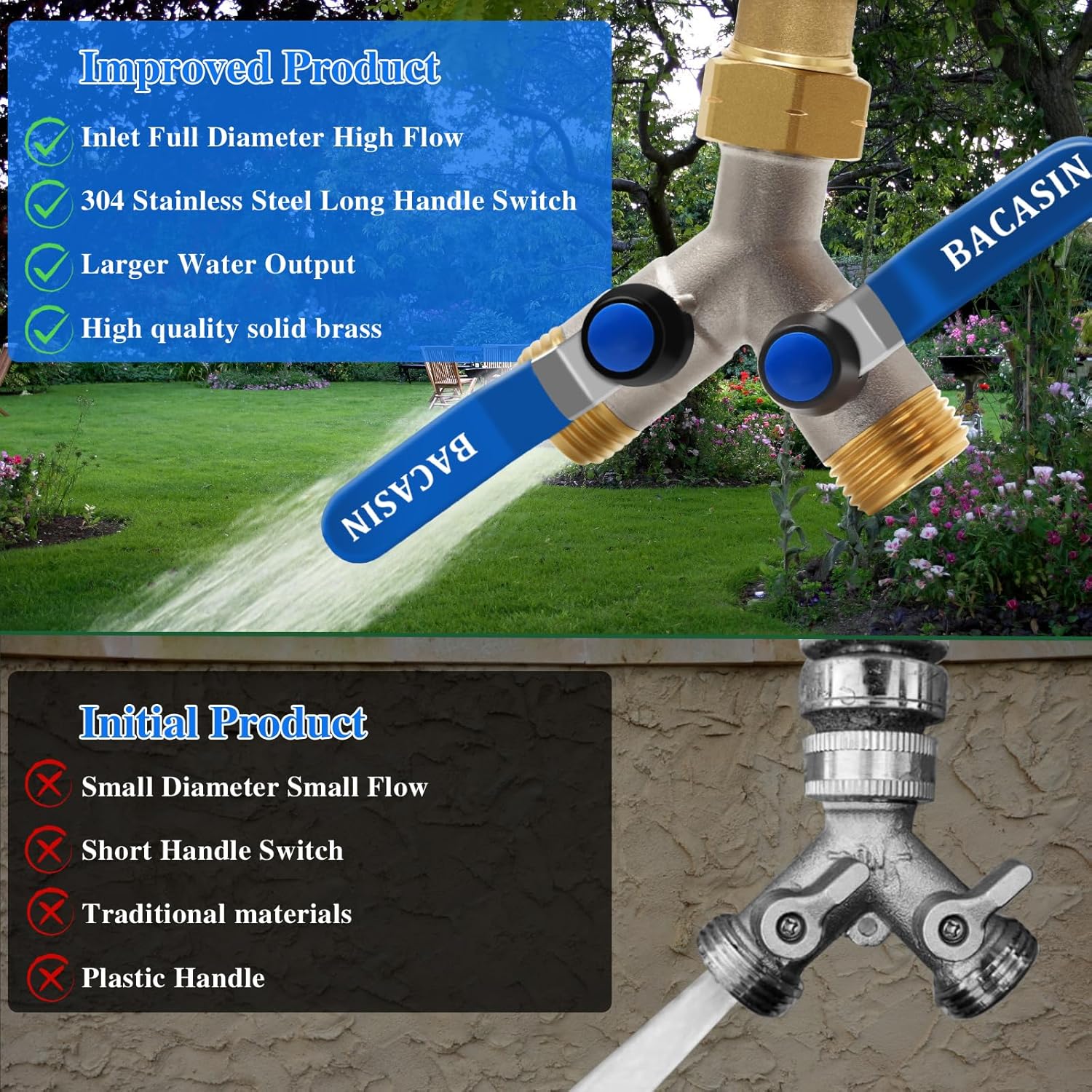 Brass Garden Hose Splitter, Garden Hose Splitter 2 Way Heavy Duty, With 2 304 Stainless Steel Extension Handles, 2-Way Y-Valve 3/4” GHT Threads (Increase Flow Style)