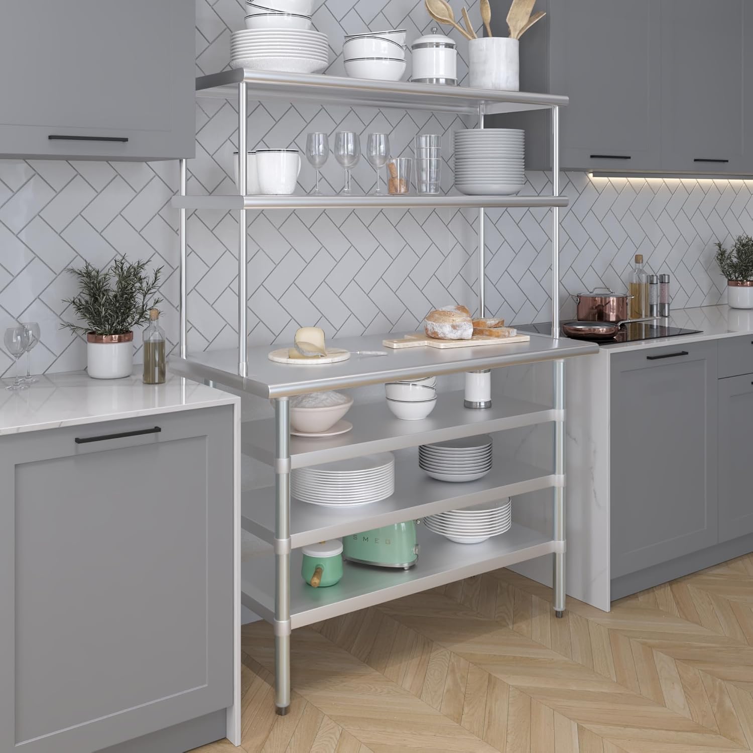 - WORK SAFETY: Work table top and double tier adjustable shelves are constructed from 18-gauge stainless steel, making this restaurant prep and serve table and double tier shelf combo set is durable and long lasting. The table top comes with a galvanized under-shelf for additional storage and adjustable legs for convenience. This table and shelf set is specifically designed and finished for use in a commercial or industrial setting, but is just as reliable in the home.