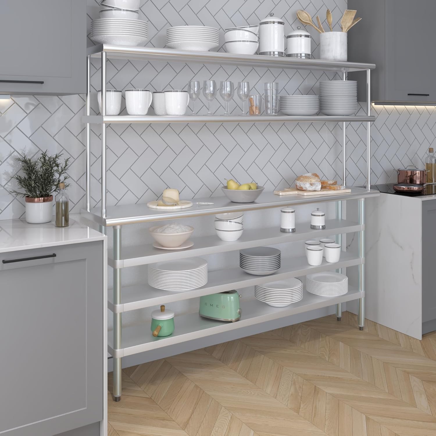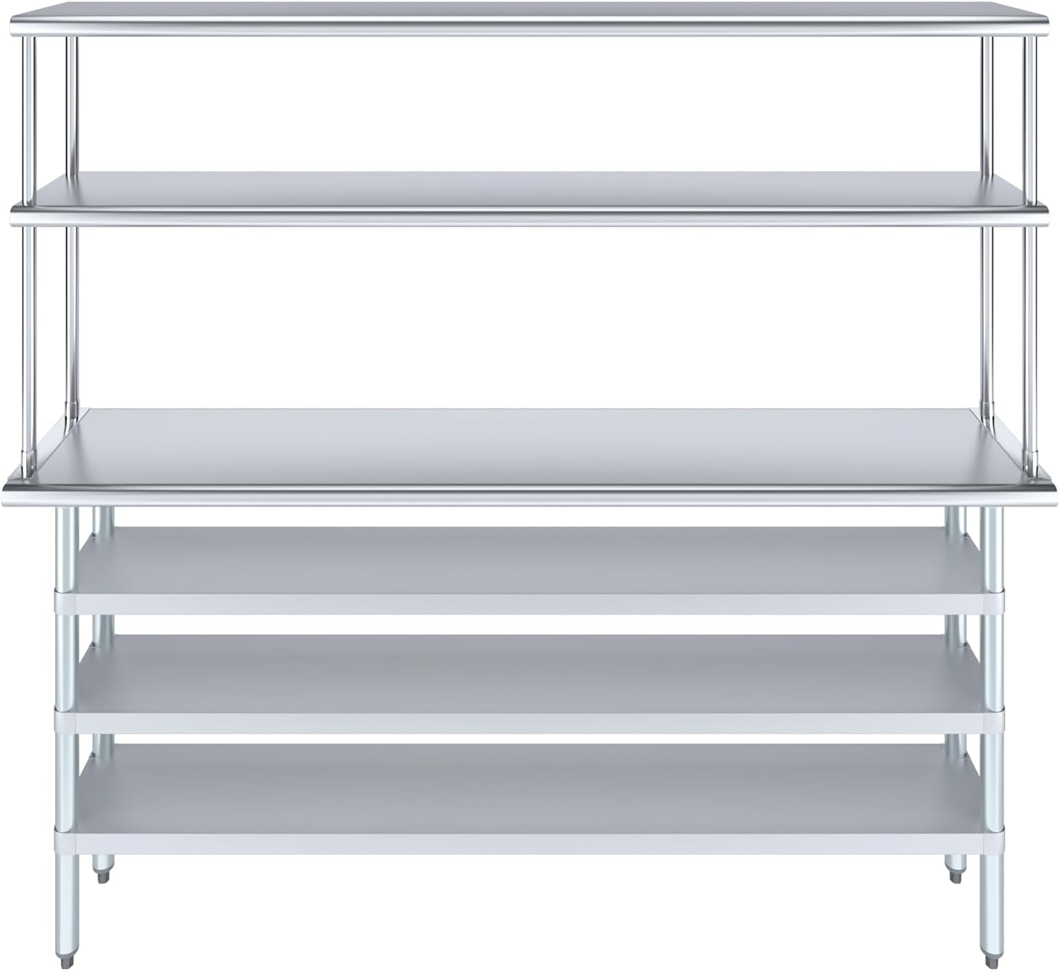 - WORK SAFETY: Work table top and double tier adjustable shelves are constructed from 18-gauge stainless steel, making this restaurant prep and serve table and double tier shelf combo set is durable and long lasting. The table top comes with a galvanized under-shelf for additional storage and adjustable legs for convenience. This table and shelf set is specifically designed and finished for use in a commercial or industrial setting, but is just as reliable in the home.