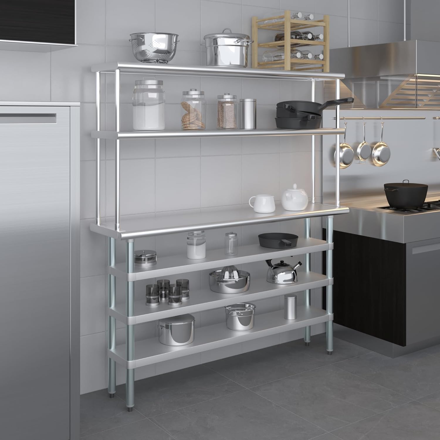 - WORK SAFETY: Work table top and double tier adjustable shelves are constructed from 18-gauge stainless steel, making this restaurant prep and serve table and double tier shelf combo set is durable and long lasting. The table top comes with a galvanized under-shelf for additional storage and adjustable legs for convenience. This table and shelf set is specifically designed and finished for use in a commercial or industrial setting, but is just as reliable in the home.