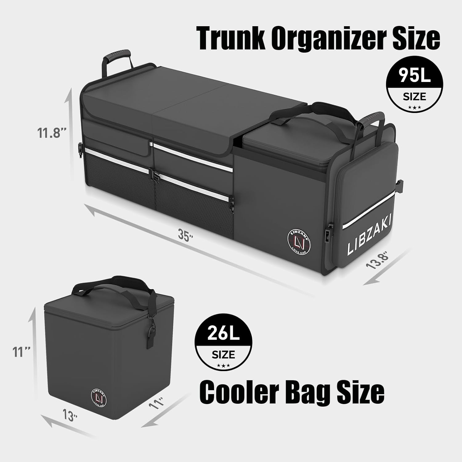 LIBZAKI Oversize 4 in 1 Car Trunk Storage Organizer, Multi Compartment Collapsible Trunk Storage Box with Cooler Bag for Car Truck SUV-Black