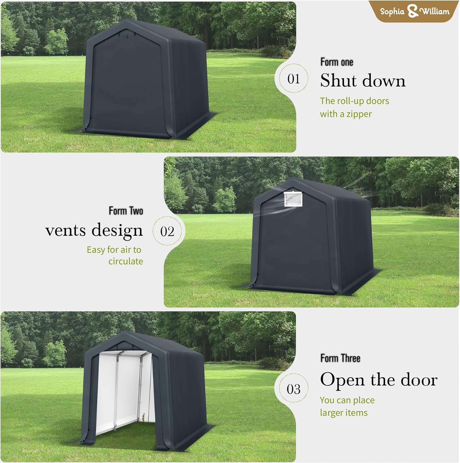 - Roll Up Doors: The storage tents equipped with rolling shutter doors, which can effectively protect your belongings from wind, sun, and rain. There is a zipper on both sides, providing better privacy space. Visible window on the door provide good air flow and indoor light