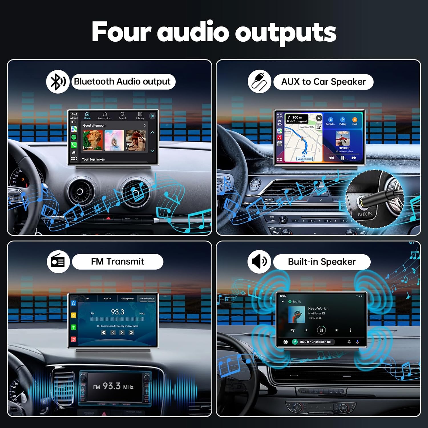 - Four Ways for Audio Output: The carplay display supports multiple audio outputs, including Bluetooth transmit, FM transmit, AUX output and a high-quality built-in speaker, giving you flexible options for enjoying your favorite music and audio content.
