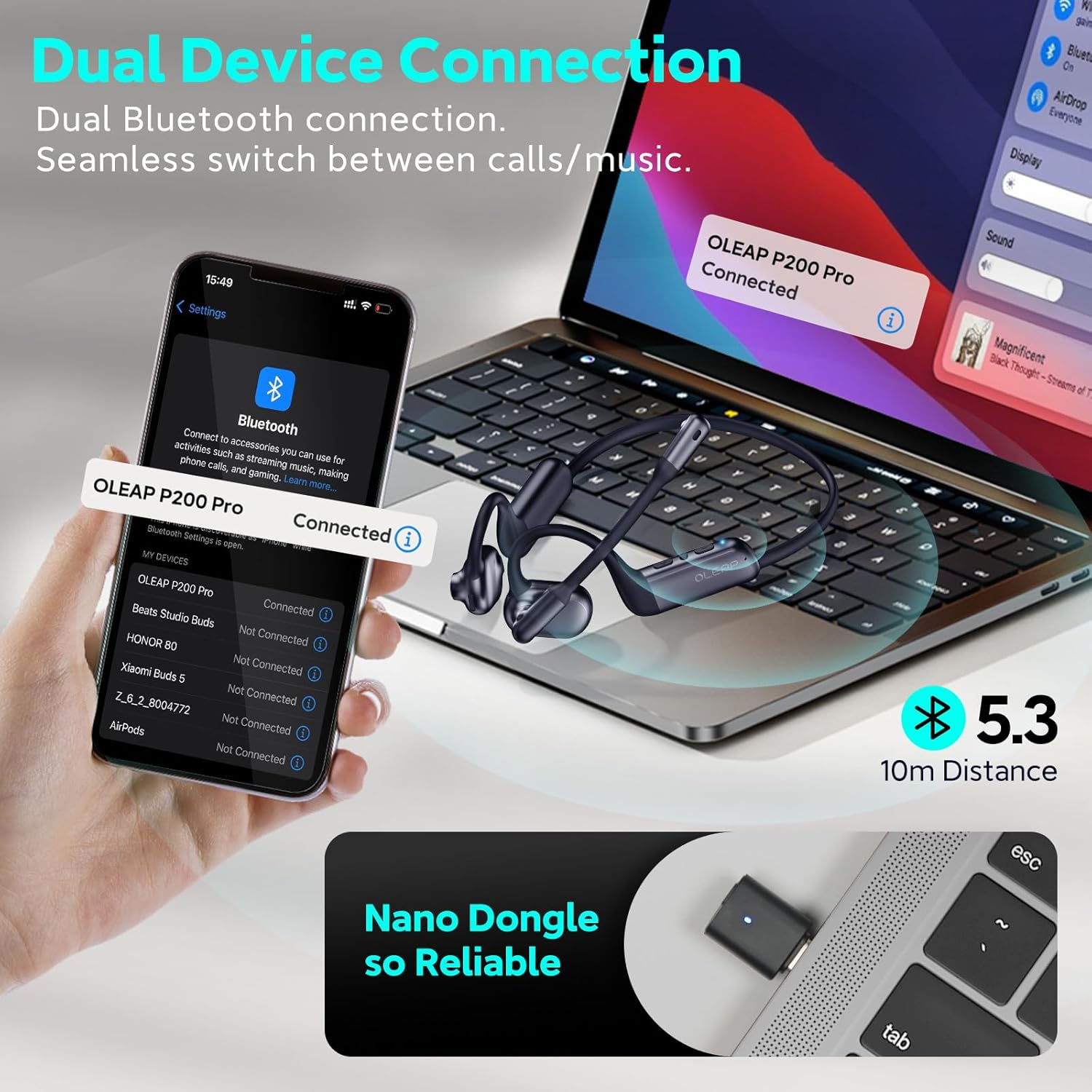 - 【Effortless Multi-Device Connectivity】: With Bluetooth 5.3, our wireless headphones bluetooth deliver a stable connection up to 10 meters with our USB-C dongle, staying seamlessly staying linked to both your phone and laptop simultaneously. This means you can pause a video on your PC and answer a call from your phone without missing a beat, keeping you focused and productive all day long.