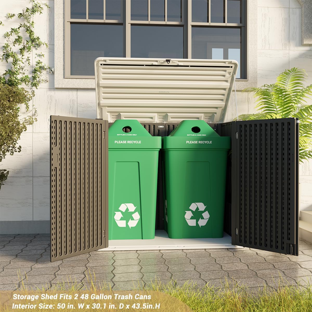 - 【Larger Capacity for Outdoor Storage】— External Size: 53.2 in. W x 34.3 in. D x 47.1 in. H; Interior Size: 50 in. W x 30.1 in. D x 43 in.H, Capacity: 48 Cubic Feet.This upgraded larger storage shed more perfectly store outdoor items, such as trash cans, garden tools, firewood and more suitable for all kinds of occasions: indoor, outdoor,balcony, yard, garden, street, etc.