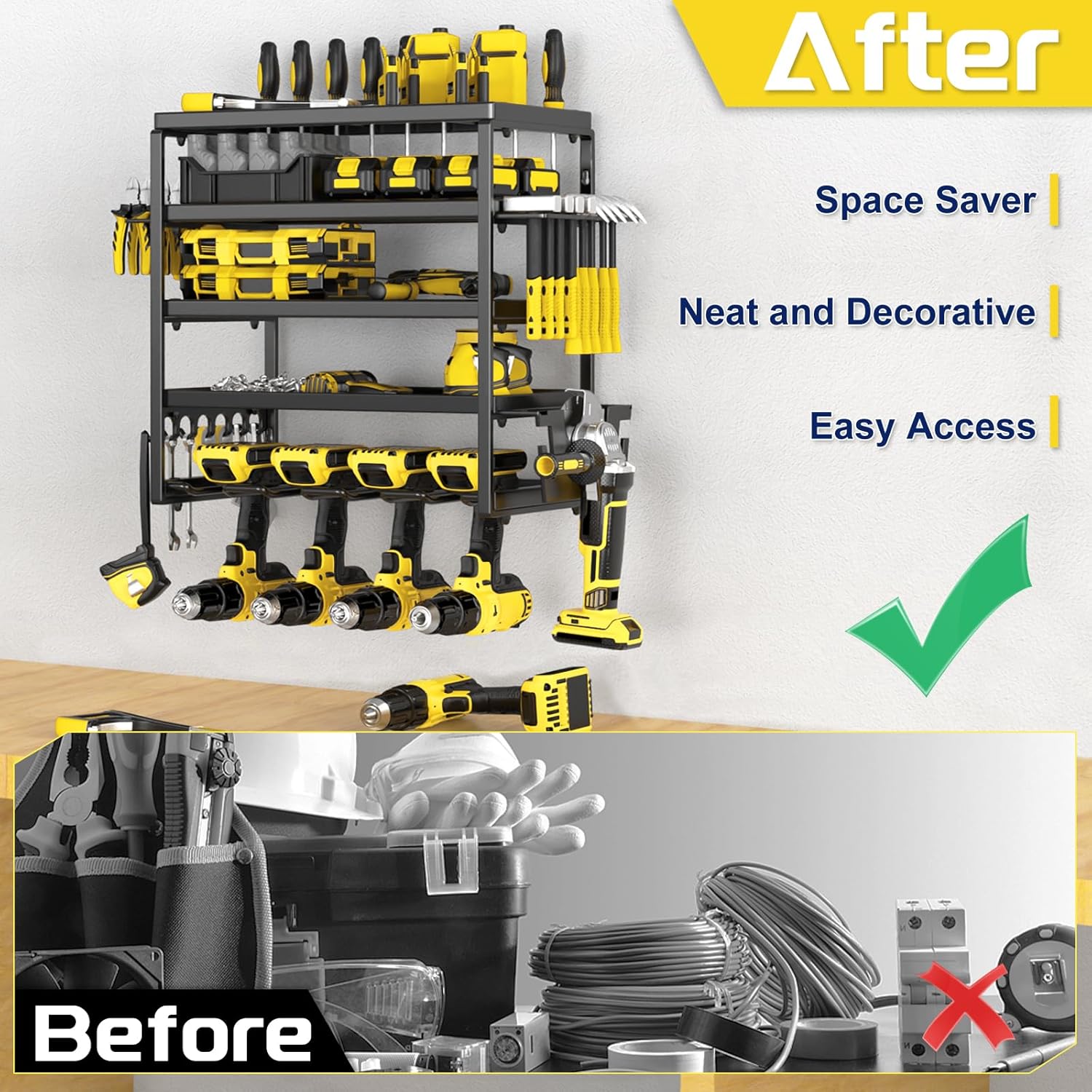 - 5 tier High-capacity Storage:This power tool organizer wall mount uses the latest five-tier high-capacity design. The bottom layer can store 4 cordless drills, the upper Four layers can store other heavy tools or various small tools, and a hammer holder, pliers holder and large cutting tool holder are added to the side,with 6 hooks for hanging tools such as tape measures or wrenches, adding diversity to your storage options