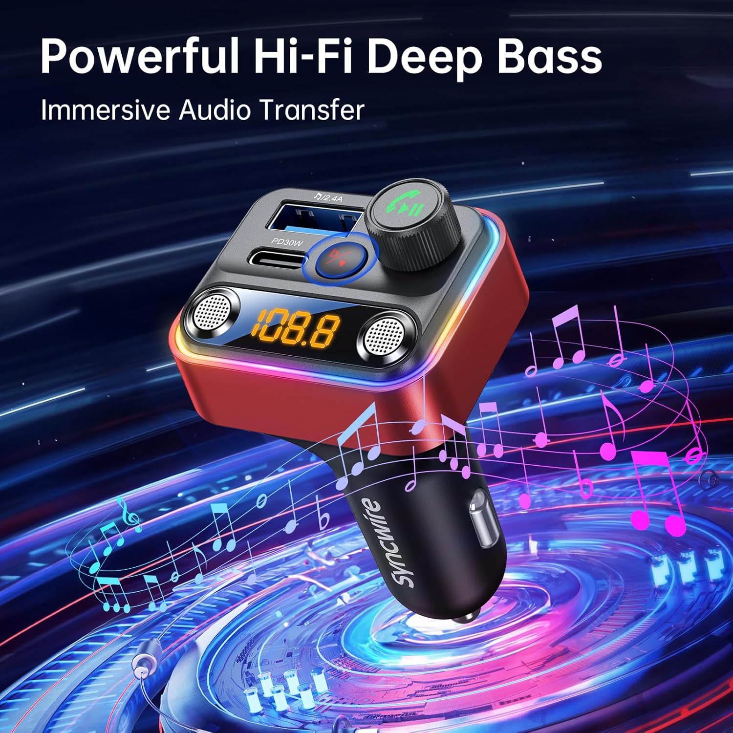Syncwire Bluetooth 5.4 FM Transmitter Car Adapter 42W [Light Switch] [Stronger Dual Mics] [HiFi Deep Bass] [Fast Charging] Wireless FM Radio Music Adapter Hands-Free Calling Support USB Drive, Red
