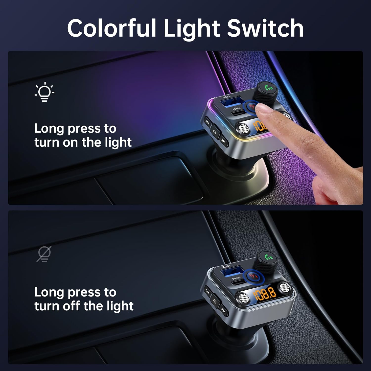 - ăHi-Fi Deep Bass & Ambient BacklităJust press the button "B" and you will enjoy powerful deep bass and immersive car FM radio stereo sound. The high-fidelity Hi-Fi sound quality of the transmitter will also make the music more dynamic and pleasing to the ear, elevating your musical journey to unprecedented heights.