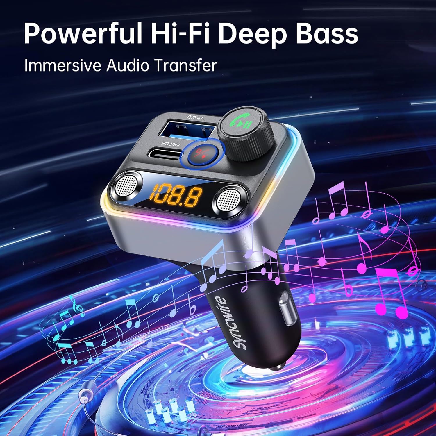 Syncwire Bluetooth 5.4 FM Transmitter Car Adapter 42W [Light Switch] [Stronger Dual-mic] [HiFi Bass Sound] [Fast Charging] Wireless FM Radio Music Adapter Hands-Free Calling Support USB Drive, Silver