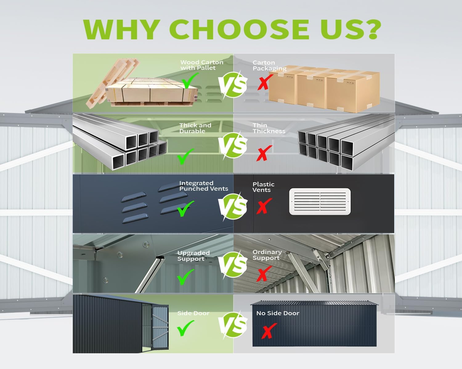 • 🏡Durable & Sturdy Frame: Durable construction with galvanized steel reinforcement makes this 20x13 storage buildings and sheds rustproof, UV-resistant and moisture-proof. The metal garden tool shed with reinforced thick metal beams and reinforced brace to support the roof, which can easily cope with all kinds of harsh weather and has a long service life.