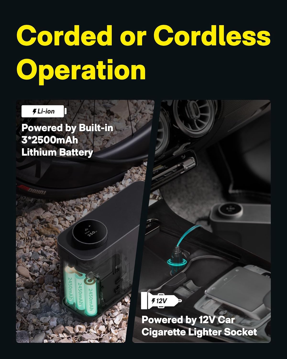 • DUAL POWER OPTION: Our tire inflator offers flexibility with both a built-in array of 2500 mAh*3 lithium batteries for wireless operation and a 12V DC car connector for continuous usage (Please Note: In this state, the machine will run normally, but it cannot be charged). Perfect for situations where efficiency and convenience are essential