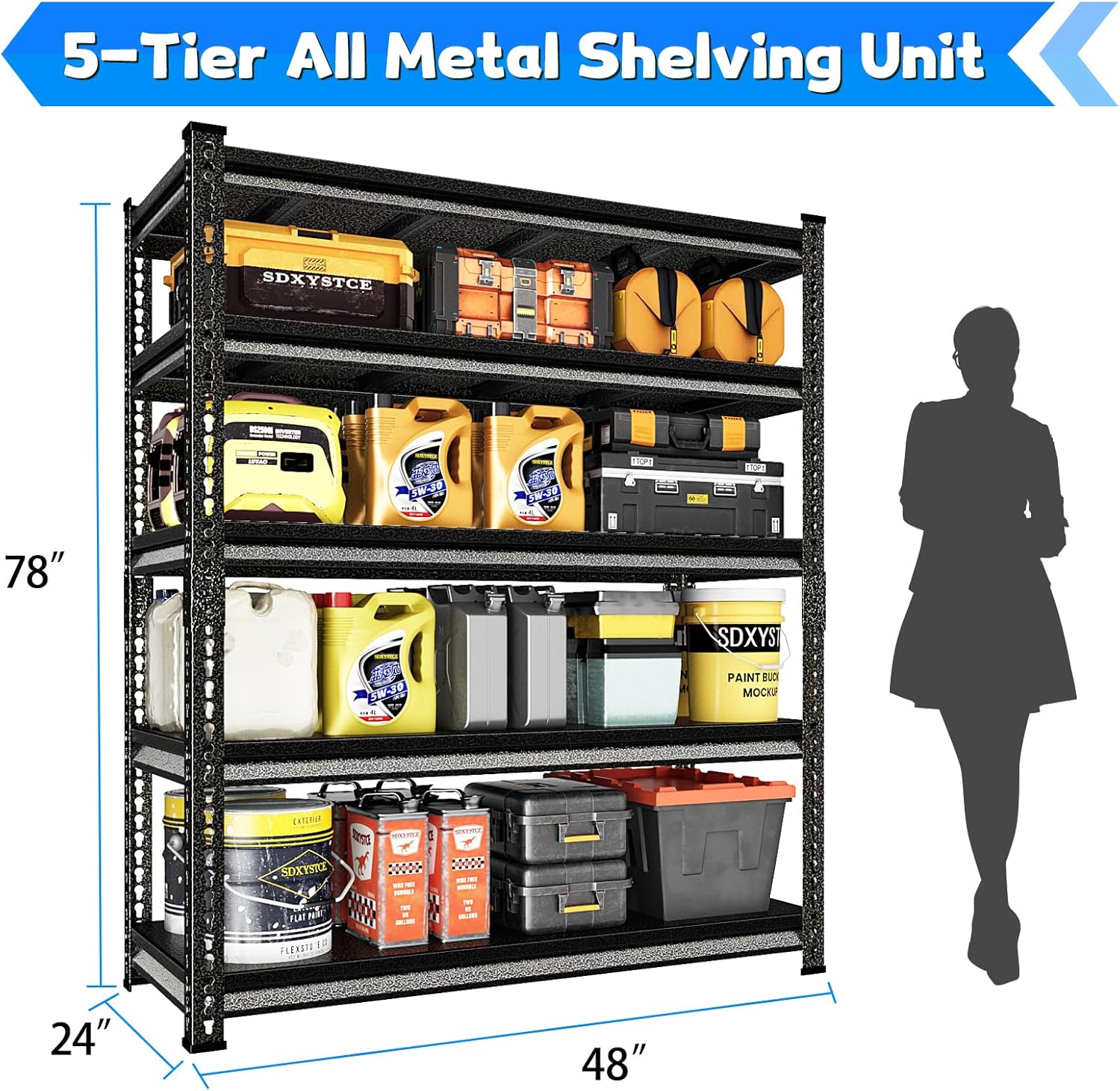 - ă3000 lbs Load CapacityăSDXYSTCE 5-tier garage organization shelves is made of heavy duty steel, every solid thickened metal shelf with 3 big ribs beneath can hold up to 600 lbs.The garage shelves heavy duty offers a high total weight capacity of 3000 lbs for organizing heavy-duty stuff and tools in your garage or warehouse.