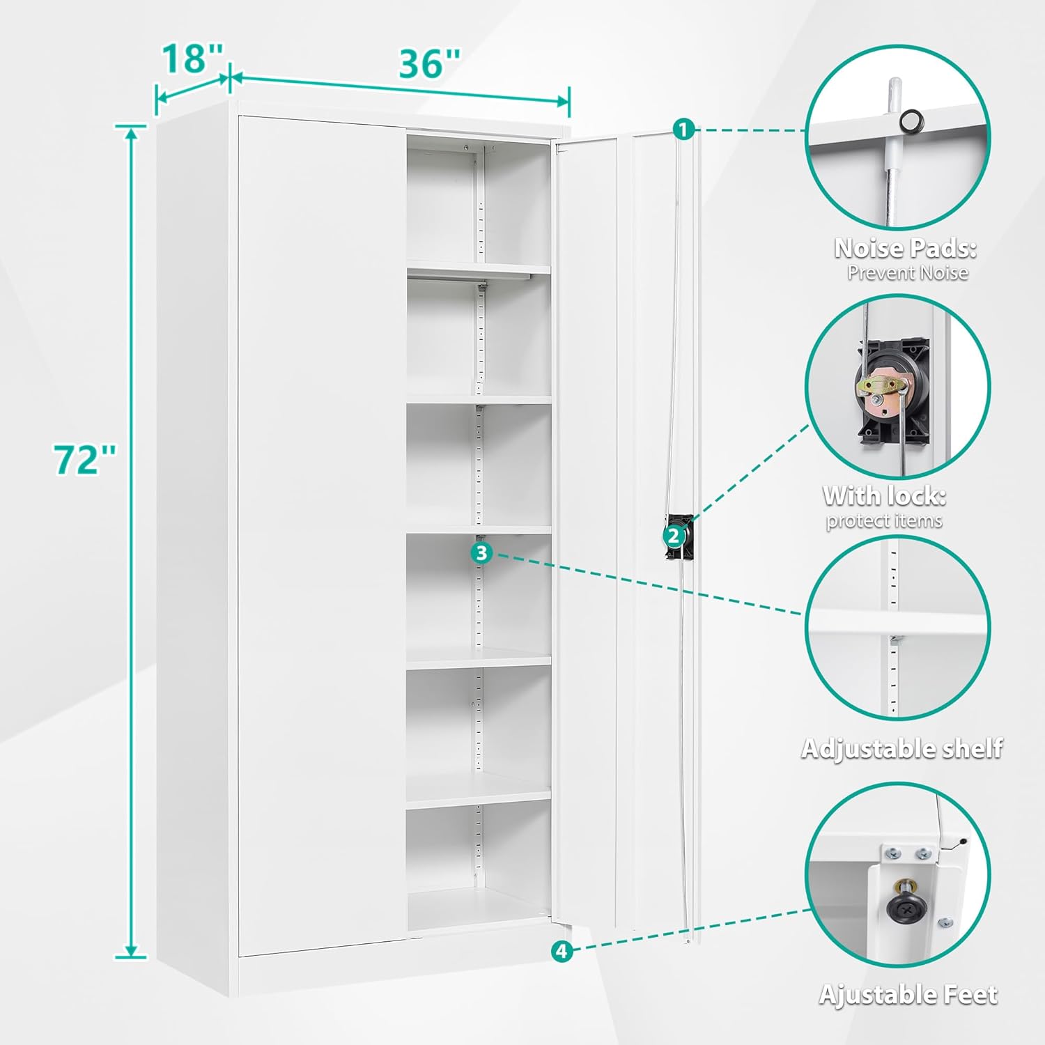 - Upgraded 5pc Adjustable Shelves : The garage cabinets storage uses 5 adjustable shelves. You can move to the desired height by adjusting the shelf pegs according to the size of the things. so that you can divide the office storage cabinet space distribution. You can also design garage storage flexibly and remove the shelves for more standing room