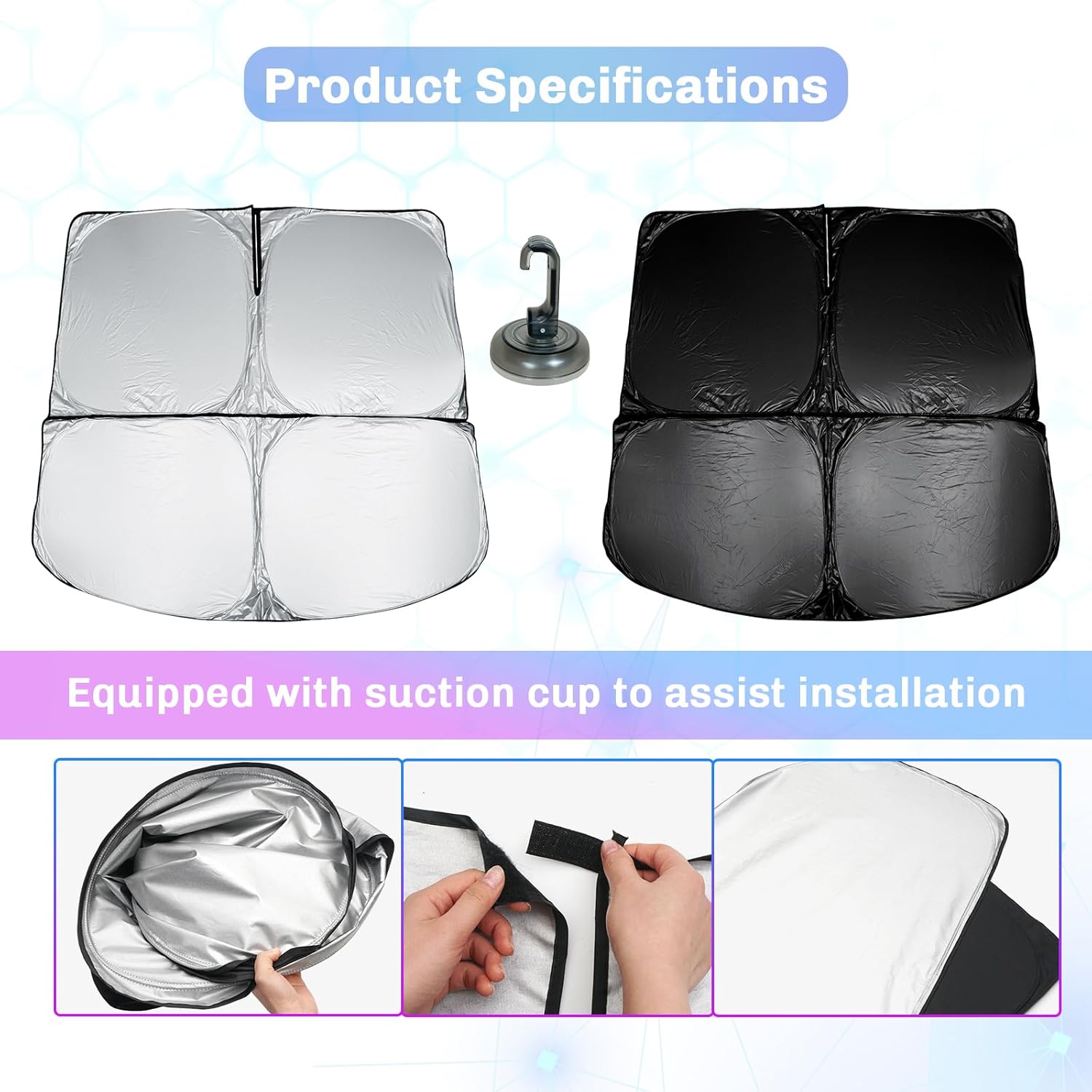 - 1.Custom Fit: this windshield sun shade is custom designed for 2024 2025 Tesla Cybertruck sunshade for 2024 2025 Cybertruck accessories front window.You don’t need to worry about oversize or too small,consider it if you need a car protector cover that protects your car interior from sunburn. 💥Tips: This product is a split design. Please use the Velcro at the connection to stick the upper and lower parts together before installing it. To prevent the middle part of the product from falling after installation, please use our included suction cup and follow the installation steps to fix it.