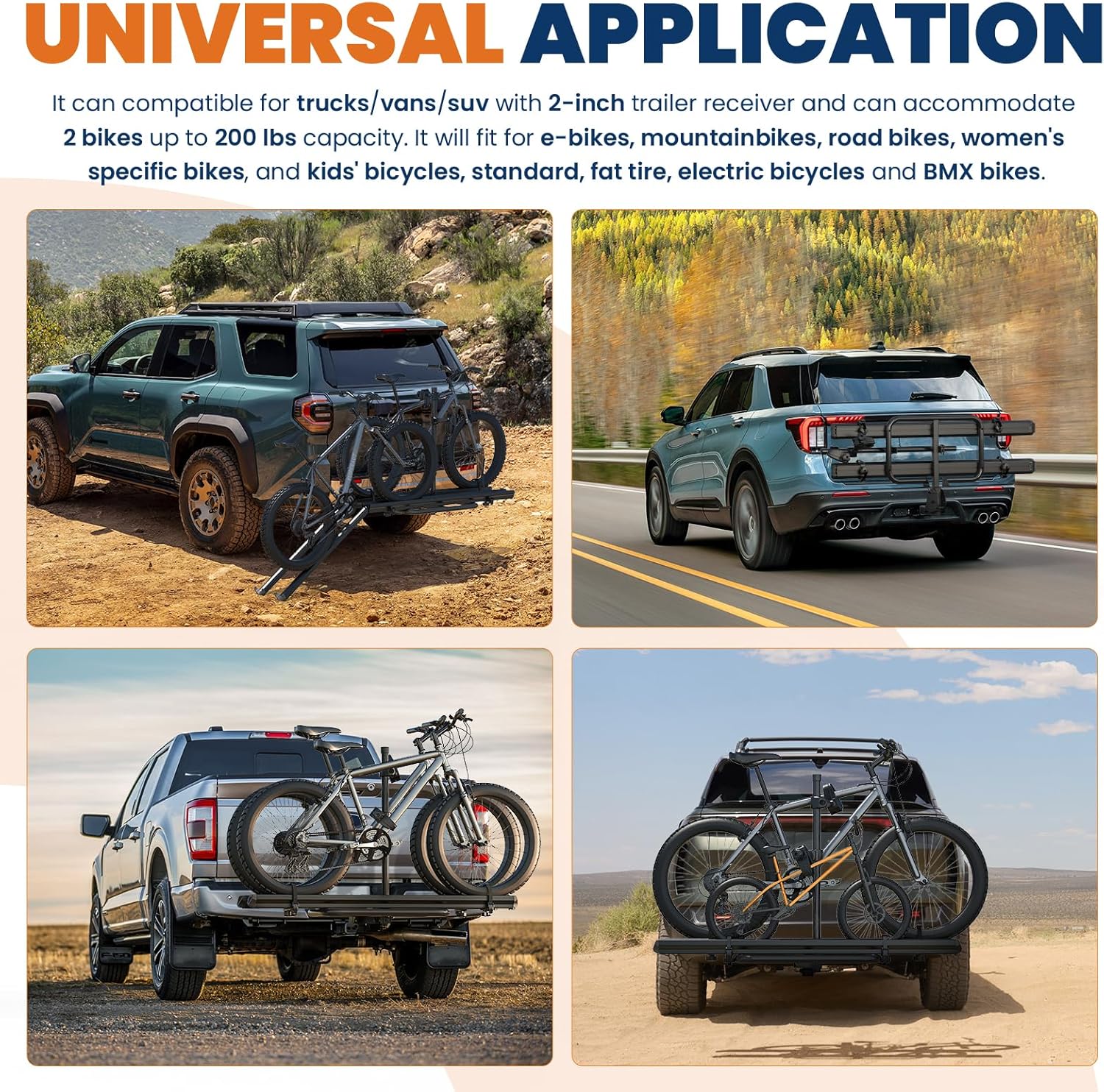 Aluminum 2 EBikes Rack Foldable 2'' Hitch Mounted Carrier Racks w/Ramps Over 200lbs Capacity for 5 inch Fat Tire Heavy Duty Universal E-Bike Racks for SUVs Cars Trucks RV 2-Inch Receiver