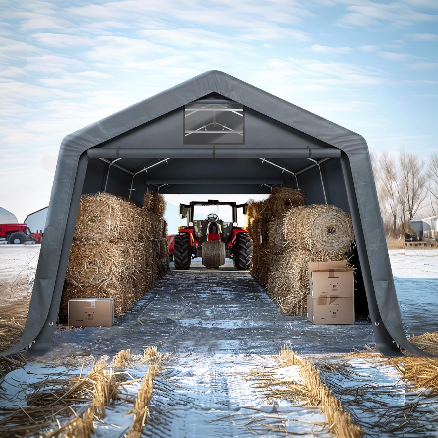 - Roll Up Doors: The car canopy is equipped with rolling shutter doors, which can effectively protect your belongings from wind, sun, and rain. There is a zipper on both sides, providing better privacy space. Visible window on the door provide good air flow and indoor light