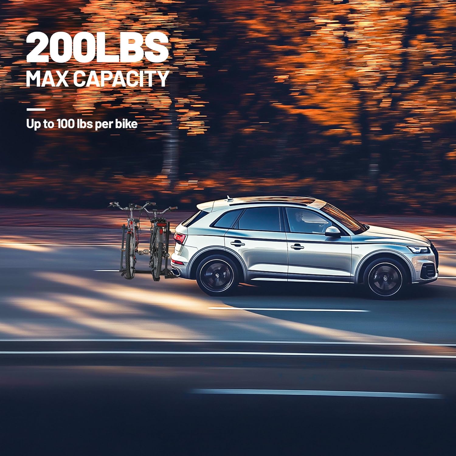 - 200 LB TOTAL CAPACITY: Easily transports up to 100 pounds per bike. Universal tire holders and wheel straps are compatible with e-bikes, mountain bikes, road bikes with up to 5β fat tires.