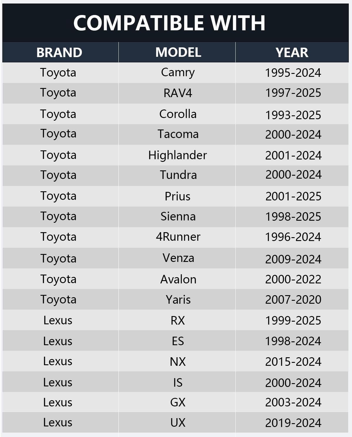- Suitable: Compatible with Toyota Camry, RAV4, Corolla, Tacoma, Highlander, Tundra, Prius, Sienna, 4Runner, Venza, Avalon, Yaris, Lexus RX, ES, NX, IS, GX, UX