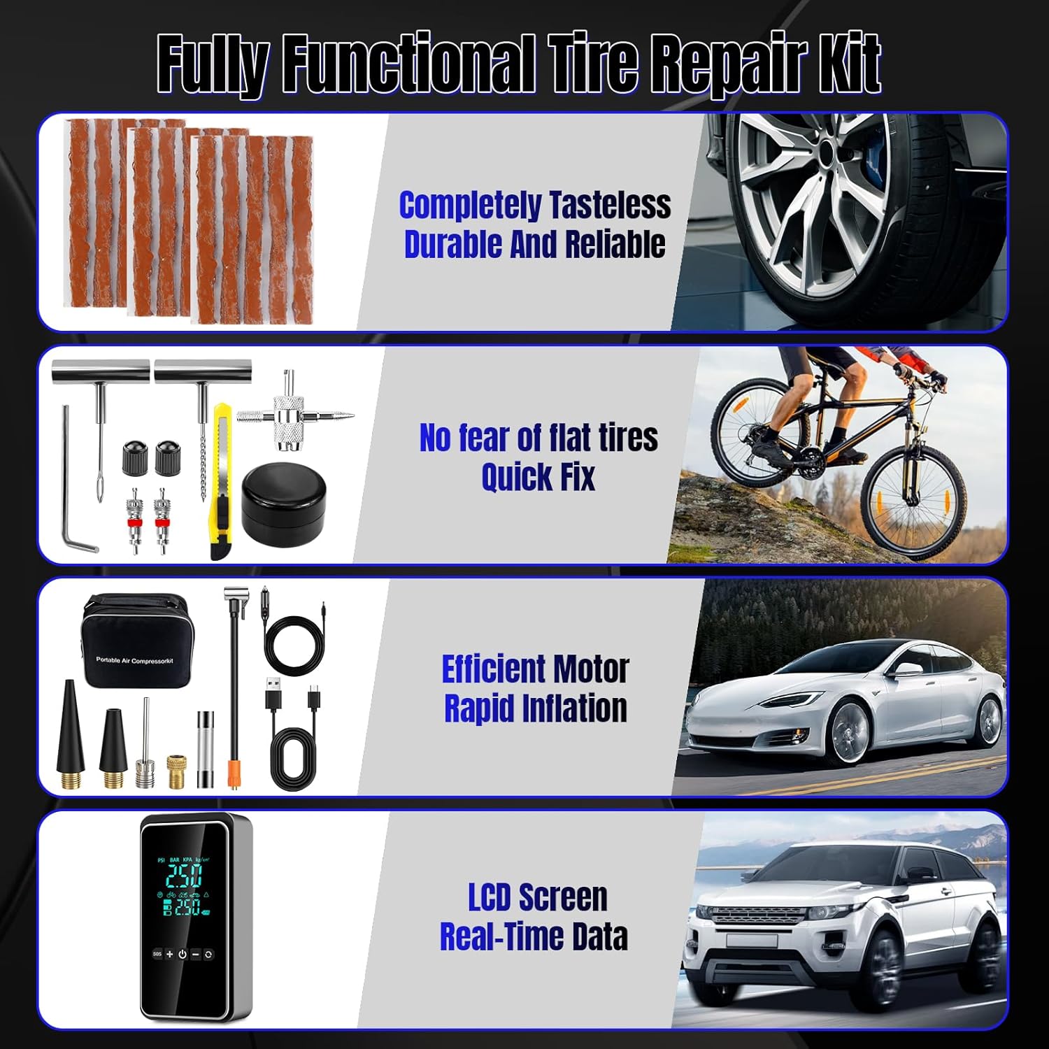 - Efficient and Convenient: This kit includes a portable air compressor and tire repair tools. In the event of a tire blowout, the can quickly fix the tire and reinflate it with the 3X Faster Inflation air compressor. Enabling you to quickly resolve the issue.