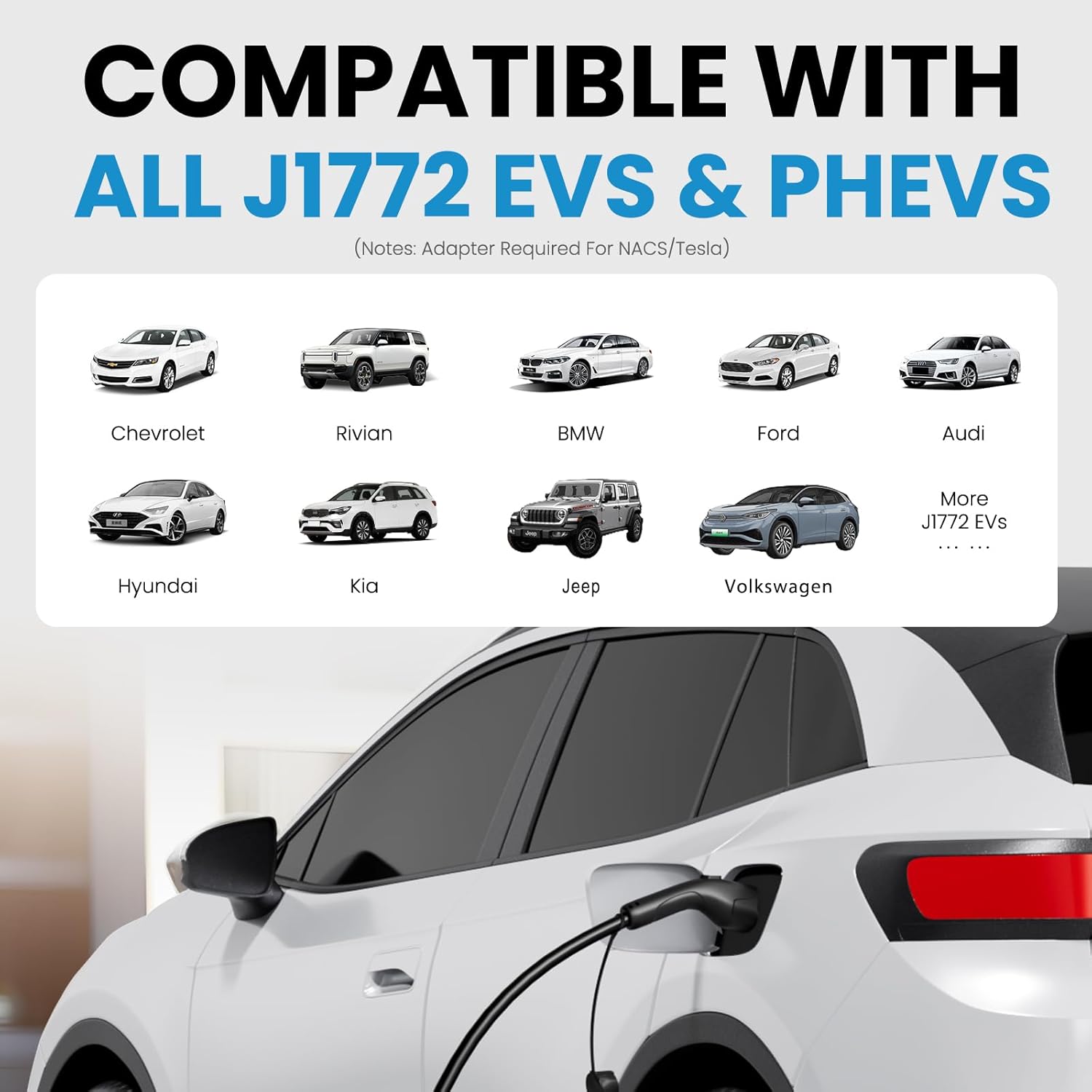 - J1772 Universal Support | All EVs. One Plug: Built with a SAE J1772 interface, Romaa j1772 charger supports all North American EVs/PHEVs including Ford, Nissan, Hyundai, Chevrolet, BMW, VW, Audi, Jeep, and Kia. Tesla compatibility via adapter (not included). The 25ft industrial-grade cable enables flexible indoor/outdoor installation—ideal for wall-mount setups or portable deployments