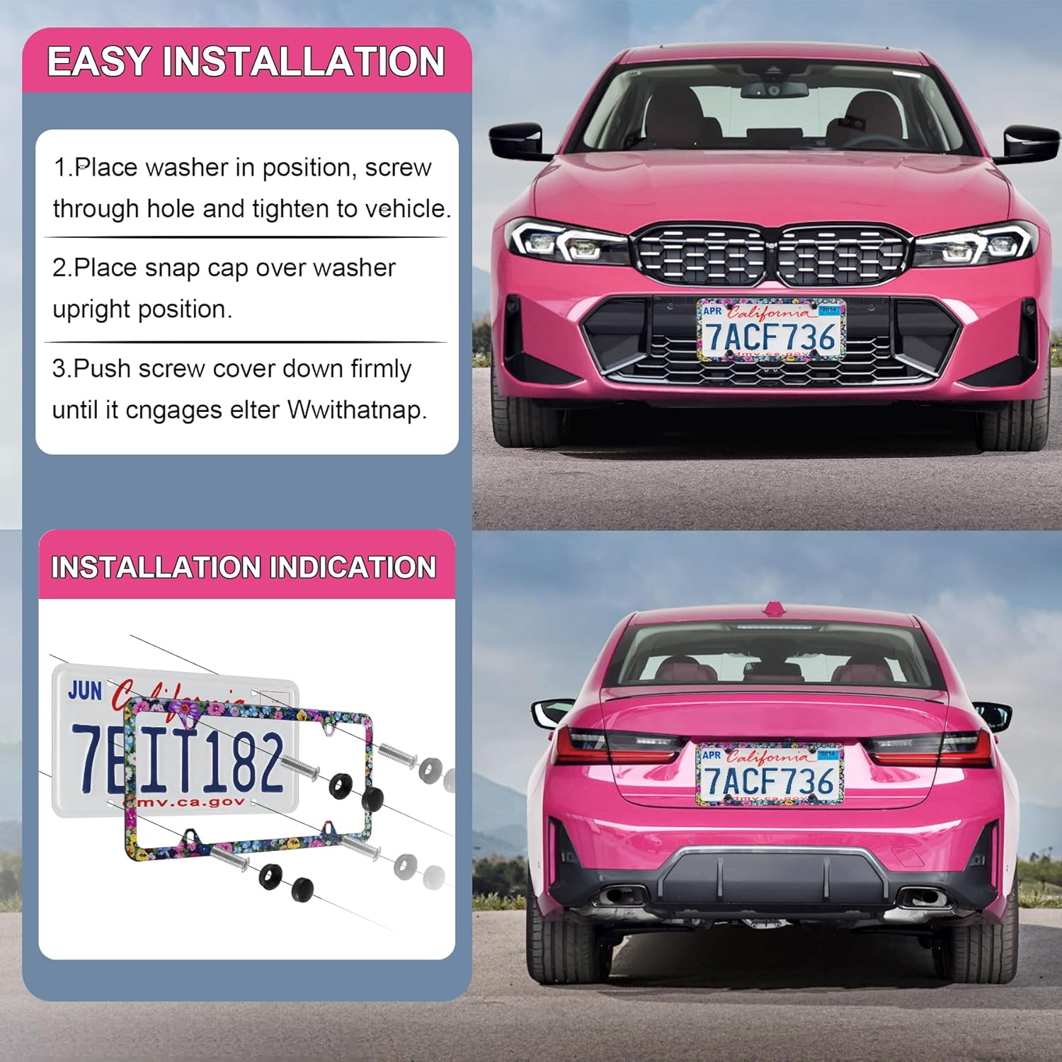 - 【Complete Installation Kit】 Includes 2 license plate frames and all the necessary accessories: 8 plastic screw caps, 8 plastic washers, 8 machine screws, 4 self-tapping screws, and 1 screwdriver. This all-in-one kit ensures easy and secure installation.