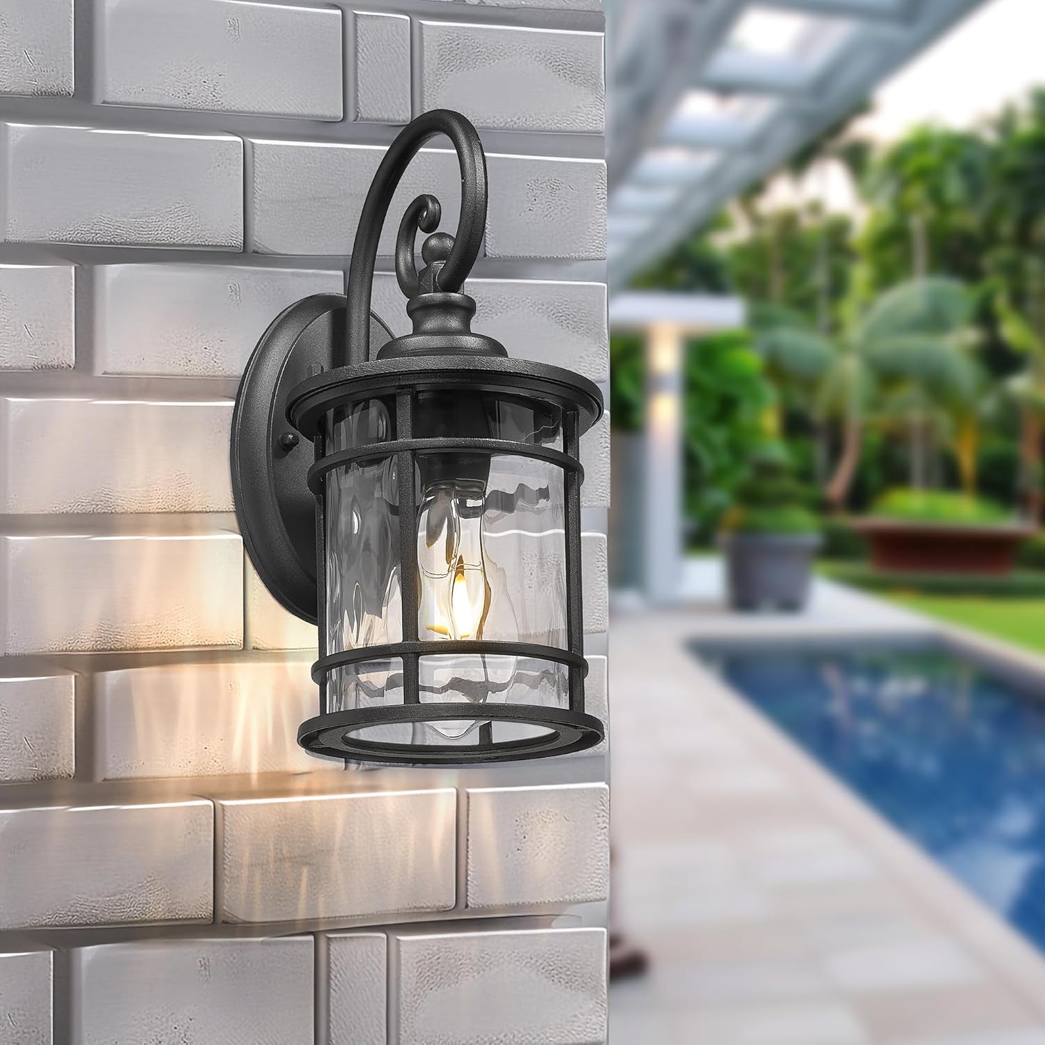 Emliviar Outdoor Wall Sconces 2 Pack, 12.4 Inch Outdoor Front Porch Lights with Water Ripple Glass in Black Finish, XE229BWG-S-2PK BK