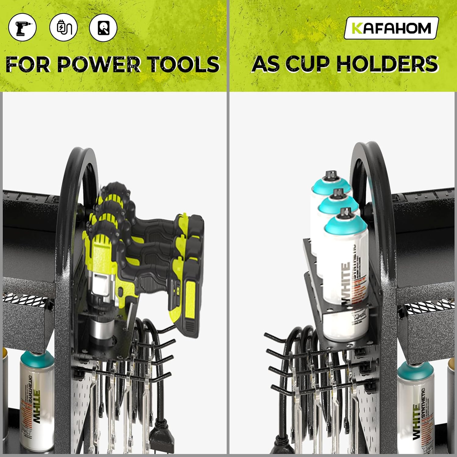 - Super Capacity: Attention, seasoned craftsmen with extensive tool collections! KAFAHOM proudly presents the ultimate storage solution - the KAFAHOM All-in-1 Power Tool Cart with drawer. Each tier is designed to accommodate multiple tools, accessories, or anything you need within reach. With an overall bearing capacity of up to 500 lbs, this heavy-duty movable power tool organizer with battery charging 8 outlet power strip.ensures you have everything you need for the toughest jobs.