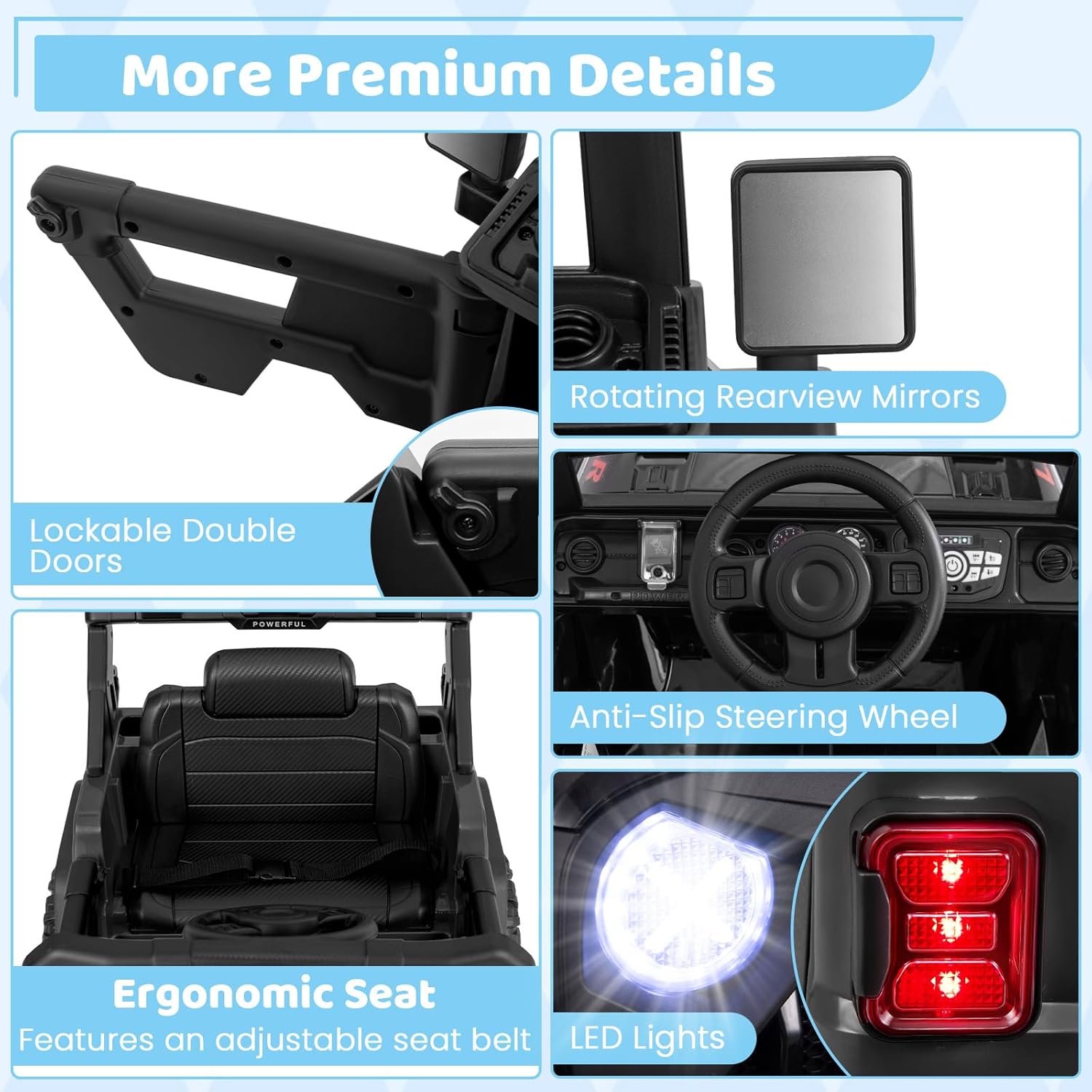 - For Realistic Adventure: The ride on car, ASTM compliant and CPSIA certificated, features more premium details, including LED lights, rotating rearview mirrors, and lockable double doors. Besides, it includes a battery display for monitoring playtime. Overall Dimensions: 41.5β x 26.5β x 27.5β (L x W x H), Load Capacity: 66 lbs.