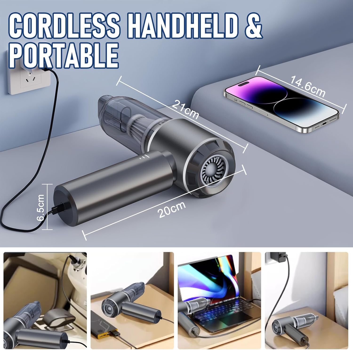 - ăRechargeable Battery & Type C Chargingă: This mini vacuum cleaner adopts 6000 mAh battery, and supports Type C charging. It can be can quickly fully charge in 4 hours with 5V/2A adapter and can be used for almost 35 mins.Equipped with a TYPE-C charging cable, it can be charged anywhere with a USB slot, whether in the car or at home.
