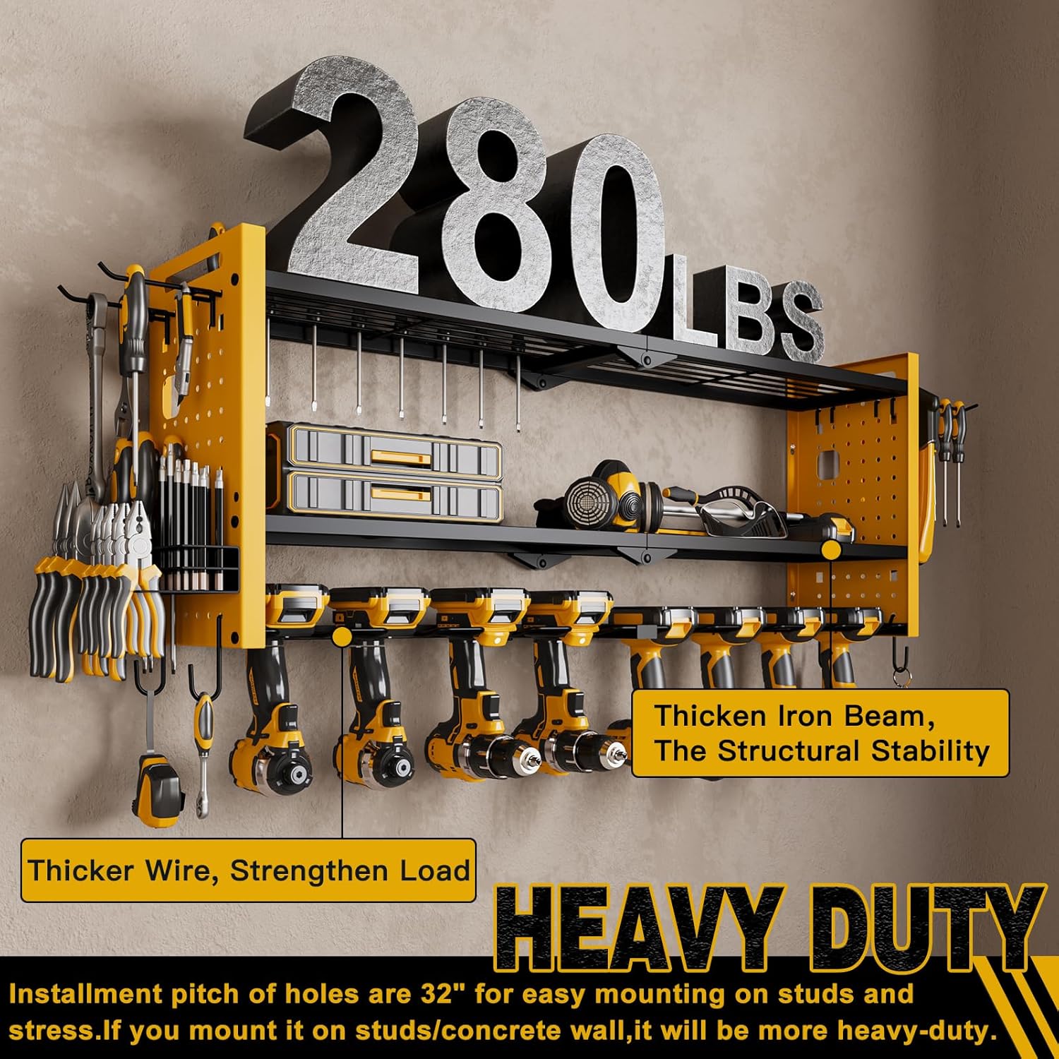 - Large Capacity:With 7.5 inches of spacing between the shelves, our wall-mounted tool organizer offers ample storage space that not only makes it easier to access your tools but also accommodates a wider variety of tool types