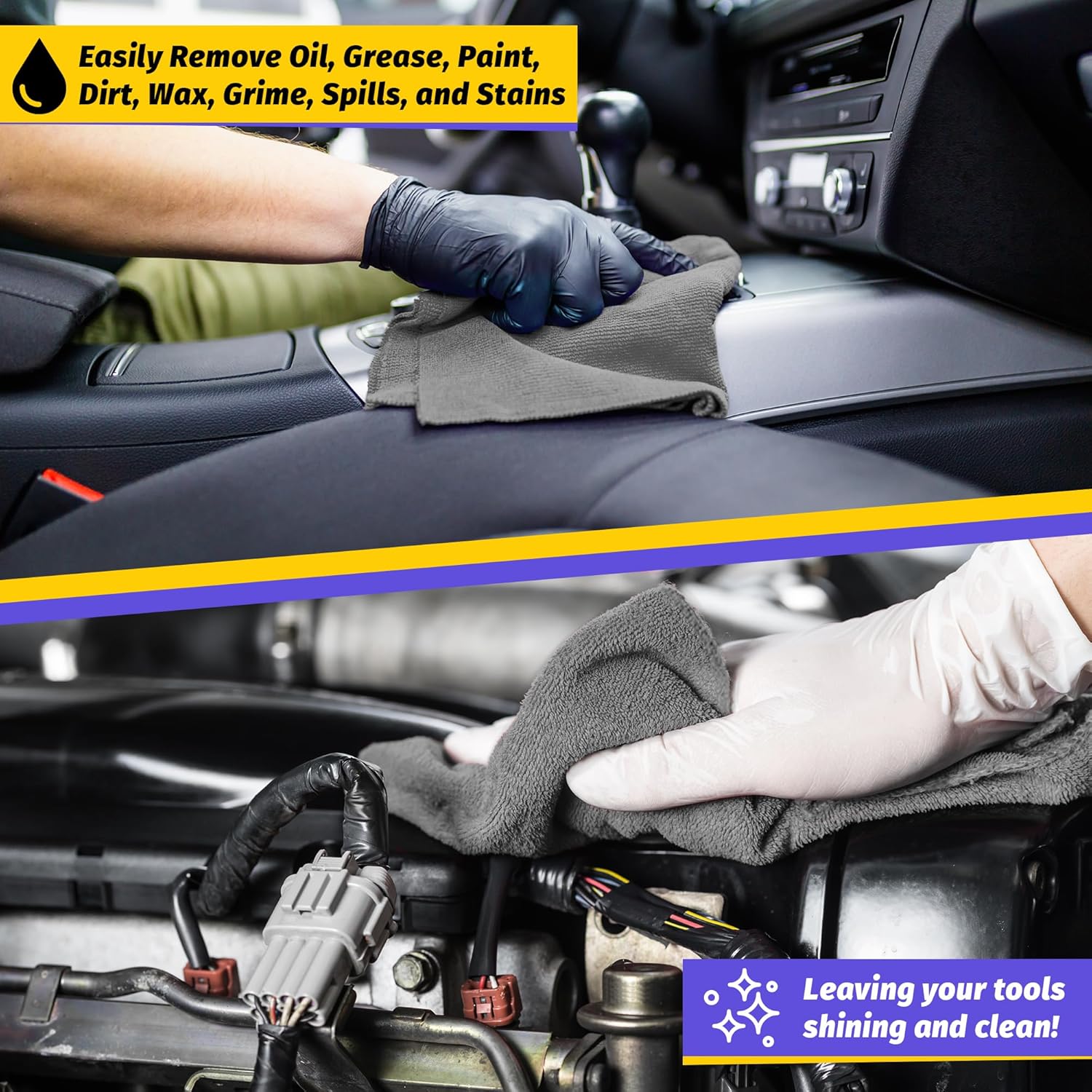 - STURDY & REUSABLE & ABSORBENT RAGS: These microfiber rags are machine washable, long-lasting, and reusable, a great alternative to paper towels. The microfiber fabric construction provides extreme durability, which prevents towels from wrinkling, stretching, or shrinking after regular usage. They can be rinsed and used many times before they go into the wash. Ideal for any workshop that regularly deals with spills like water, grease, or grime.