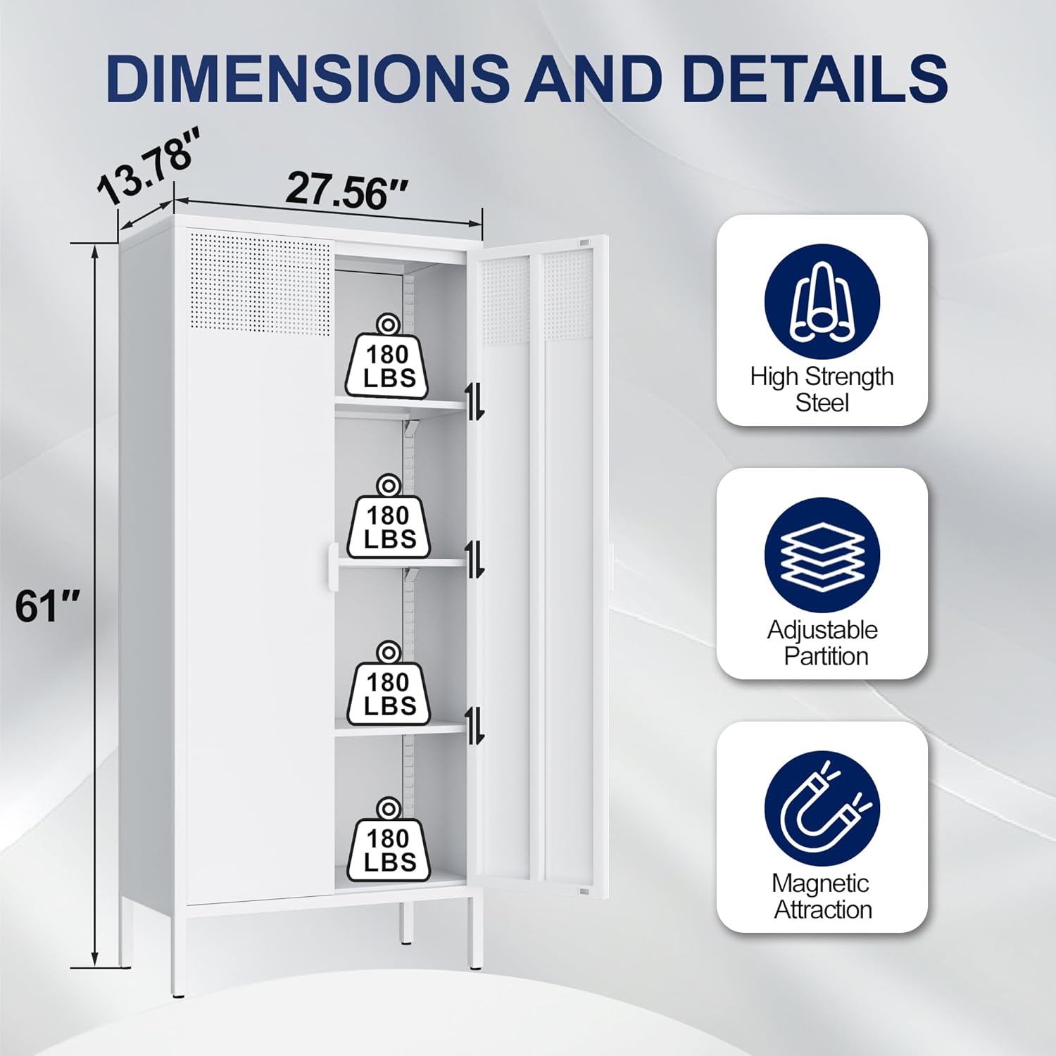 Metal Storage Cabinet with Adjustable Shelves, White, 61''H x 27.56''W 13.78''D, for Kitchen, Laundry Room, Home Office, Kids Room