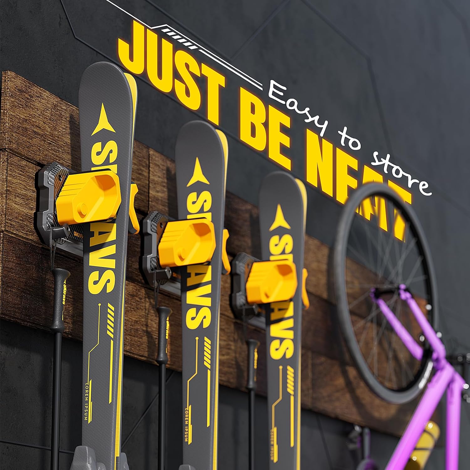 - Versatile and Stylish: Our ski holder isn't limited to just skis. It can accommodate any skis, snowboards and skateboards. Its multifunctional design also allows you to hang brooms, sleds, and other tools. With its staggered arrangement, our ski wall mount not only provides efficient storage but also adds a touch of elegance to your room, transforming it into a stylish winter sports haven.