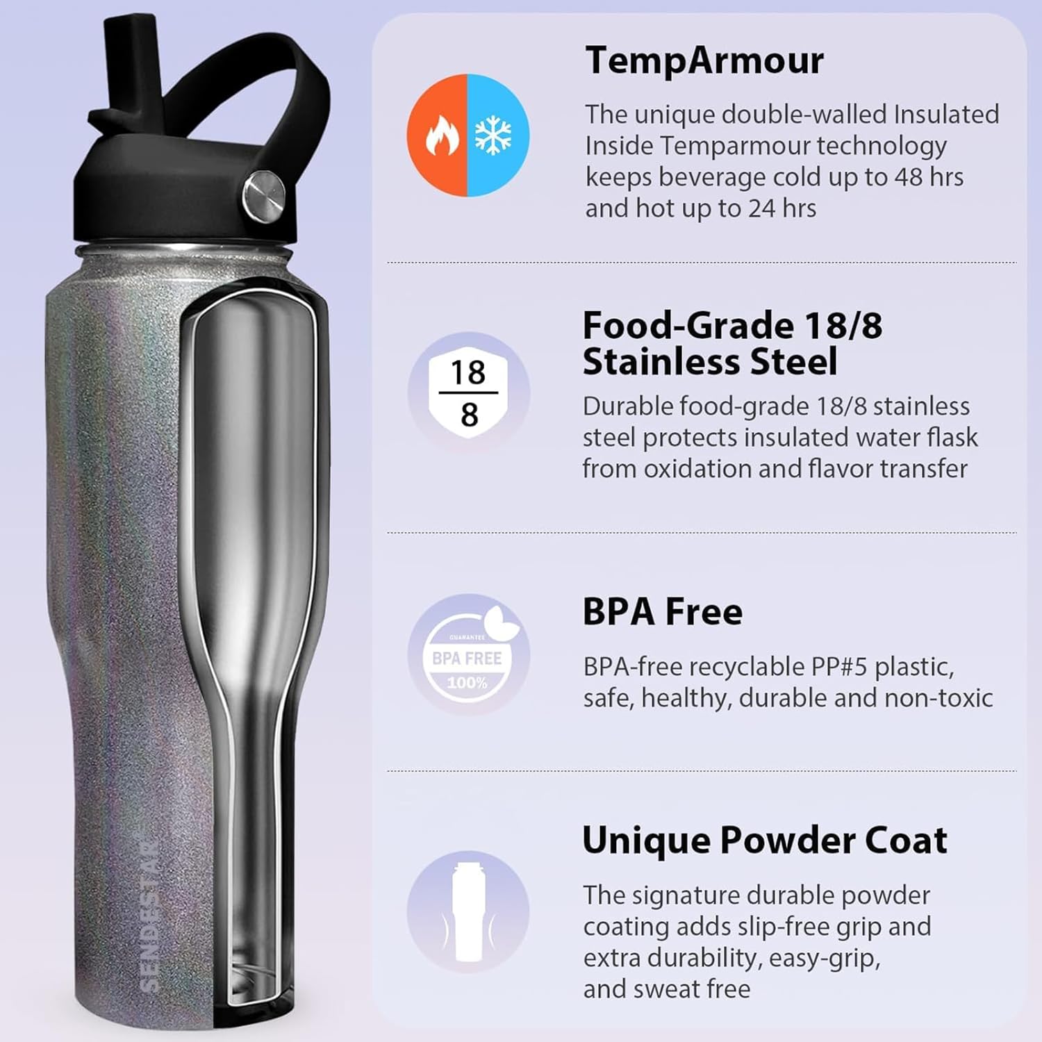 - 【VACUUM INSULATED】 Unique technology inside SENDESTAR 40oz water bottle keeps cold drink icy for up to 48 hours and hot beverage steaming up to 24 hours, make sure your every sip is the feeling you want. Excellent leak proof sealing lid prevents leakage so that you can just grab and go.