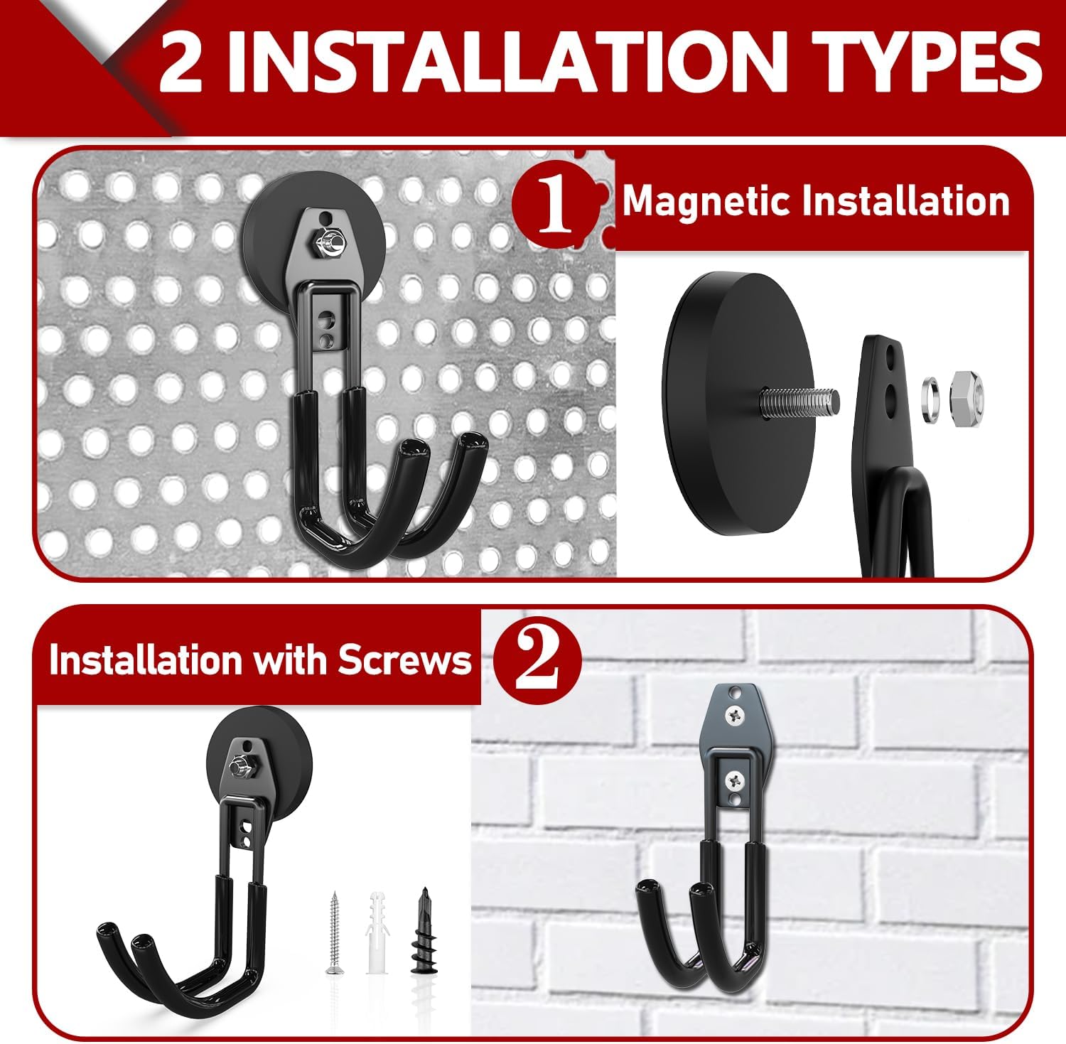 - Versatile and Effortless Installation: Enjoy the ease of our robust heavy duty hooks, offering two flexible usage options: (1) Perfect for metal surfaces, these garage magnetic hooks adhere simply without tools or drilling, ensuring no damage to the surface. (2) For enhanced versatility, the magnet can be detached, allowing independent use of the garage storage hooks. To securely store heavier tools, we provide robust screws that allow for a stable installation on multi-wall surface