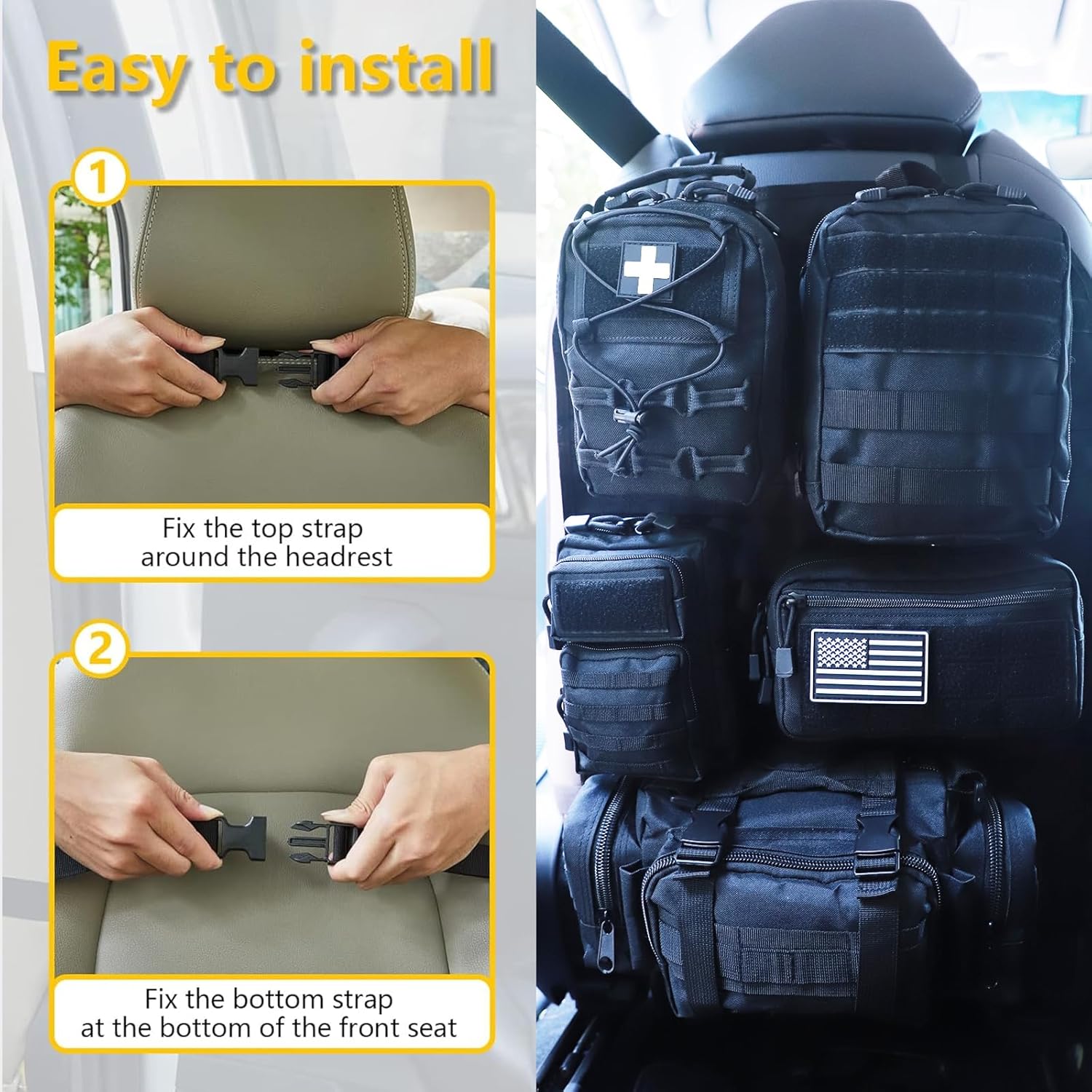- π Easy Installation - With adjustable strap,easily adjust to fit around your headrest and at the bottom between the seat back and base.Each Molle bags has been designed with velcro tape and buckle, each pouch is flexible to be added or removed.