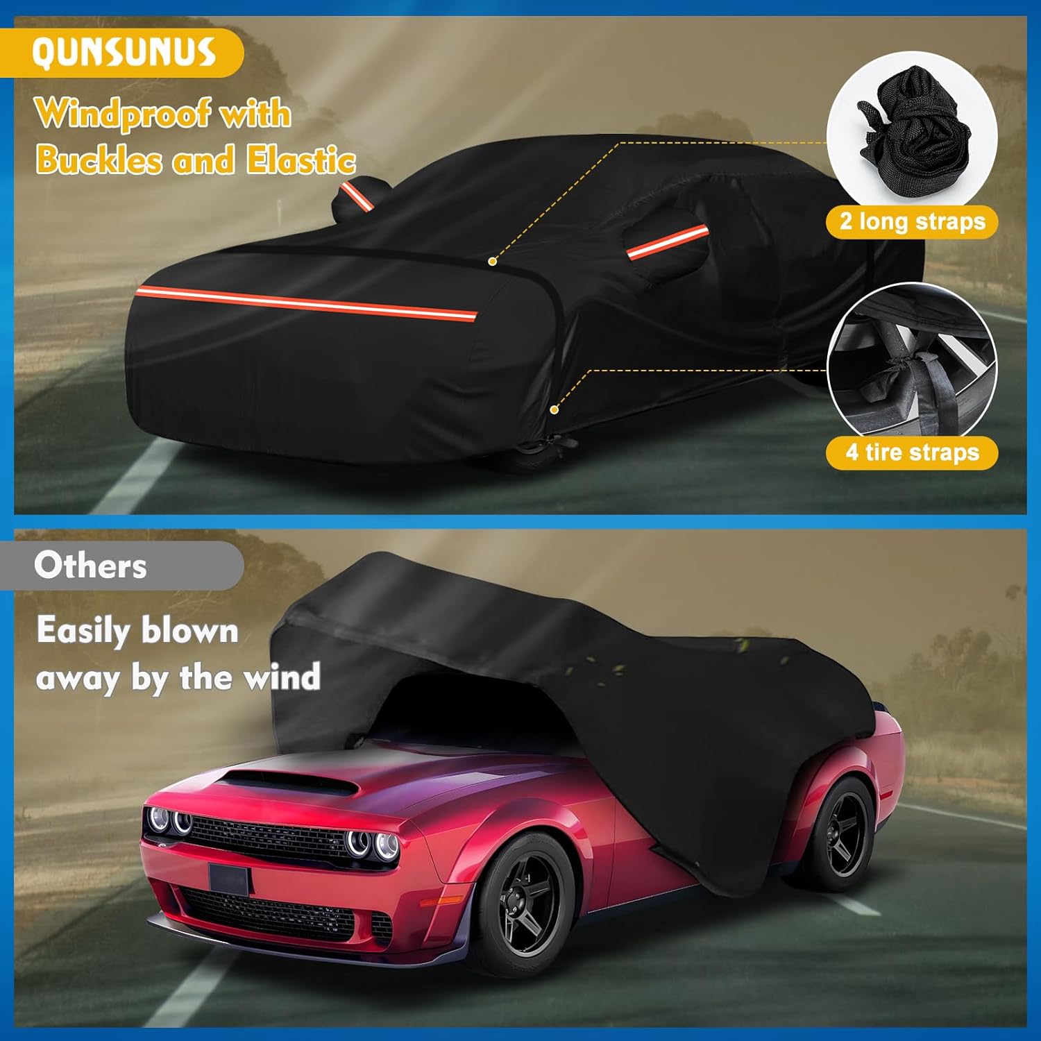 - ăWindproof Upgradeă1.There are four tire straps to keep the car rain cover secured in place.2. Buckle the windproof buckle that goes through the bottom of the car.3. Elastic hems on the front and back end for a better fit on your car.4. Two complimentary extra-long windproof straps can be strapped to your car's hood and rear.
