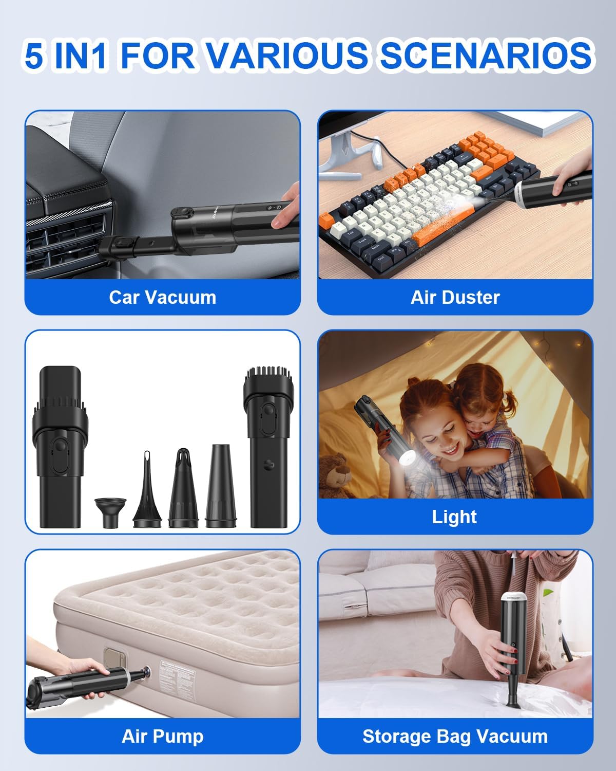 - đźš—Versatile Cleaning Attachments: This compact handheld car vacuum, measuring 11x2x2 inches, is easily portable and storable in places like drawers or glove boxes. With a range of included attachments, tackle every nook and cranny, from pet hair on upholstery to tight corners. It can also be applied to both swimming rings and inflatable pads.