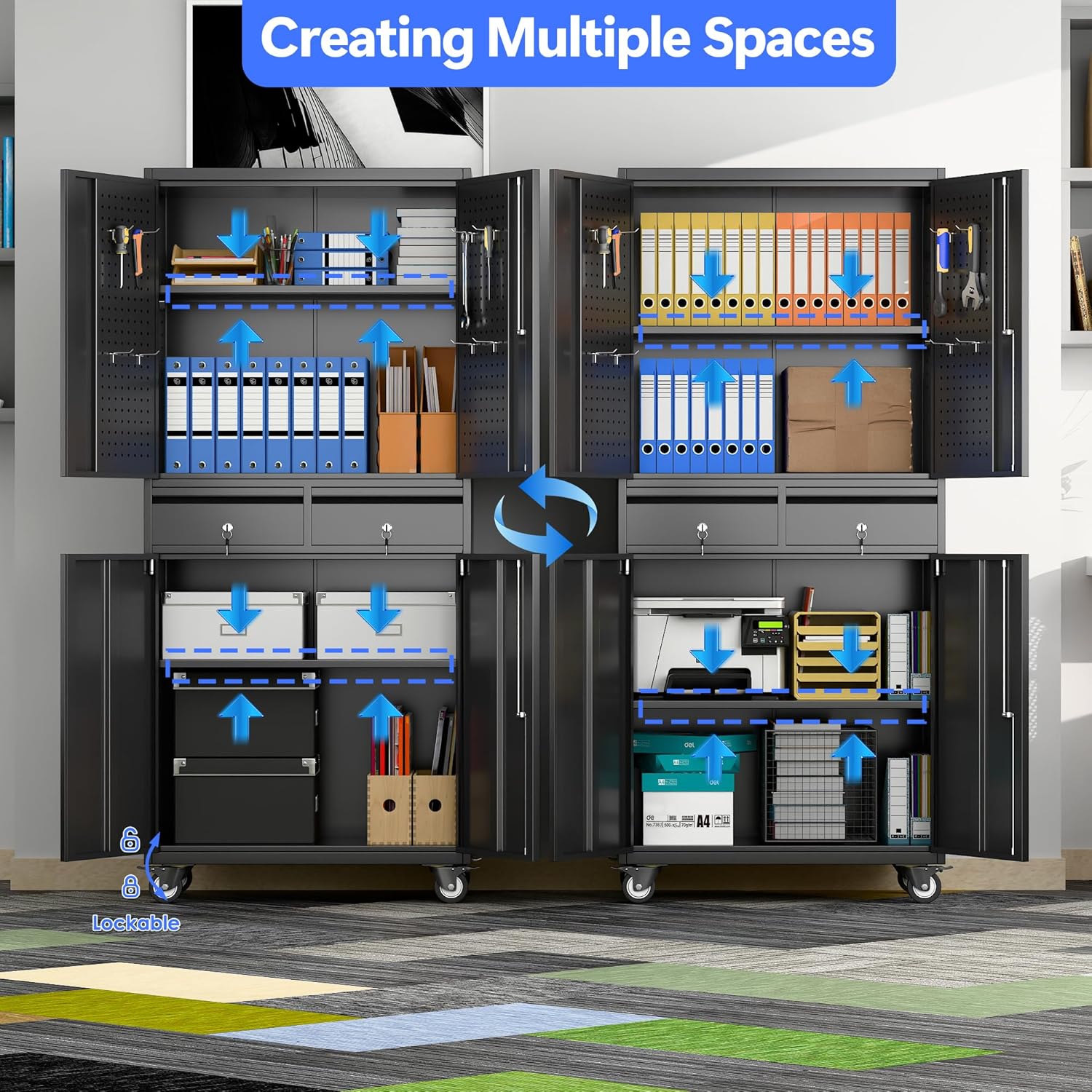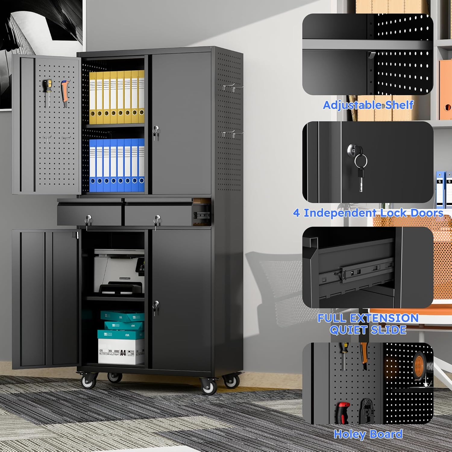 71" Metal Garage Storage Cabinet with 8 Hooks and Pegboards,2 Drawer Rolling Tool Storage with Locking Doors and Adjustable Shelves,Heavy Duty Steel Tool Cabinet for Garage, Warehouse