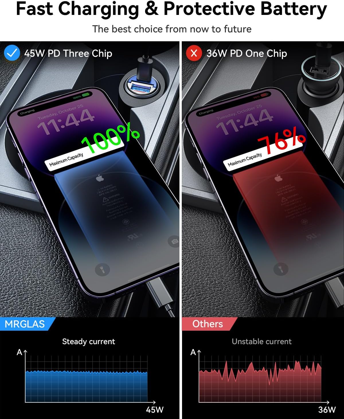 - PD45W+QC45W SUPER FAST CHARGING: MRGLAS 90W car charger adapter fast charging supports PD 45W (USB-C port) and QC 45W (USB-A port) high output, which can fast charge all major mobile phones/tablets at the same time. Allowing iPhone 16 Pro Max and Samsung Galaxy S24 to charge from 0% to 89% in 30 minutes, it helps you save more time on long trips.