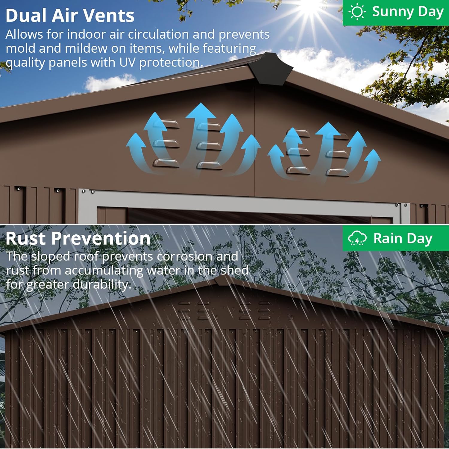 - Durable & Sturdy Construction: Constructed from thicker galvanized steel with a robust frame, this metal storage shed boasts advanced corrosion resistance and durability, providing protection against wind, rain, and UV rays in all weather conditions.