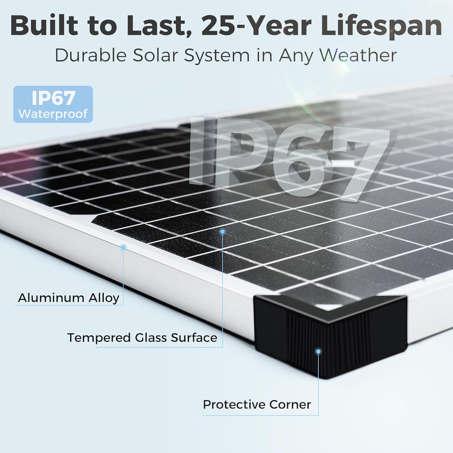 - Sturdy and Durable: With a robust tempered glass surface and a rugged aluminum alloy frame, this solar panel is weatherproof and designed for outdoor use. Its lifespan extends up to 25 years, and it operates in temperatures ranging from -40℉ to 185℉