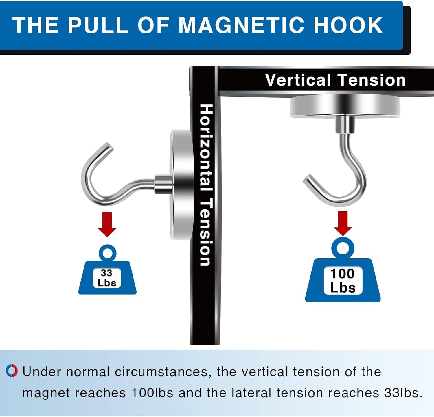 - 【BEARABLE TRACTION】 110 lbs tension of strong magnetic hook is based on the direction of tension perpendicular to the contact surface -- reduced by 2/3 if used horizontally. Please note that the tension of the magnetic hooks for hanging is also affected by the direction, the material of the contact surface and other factors.