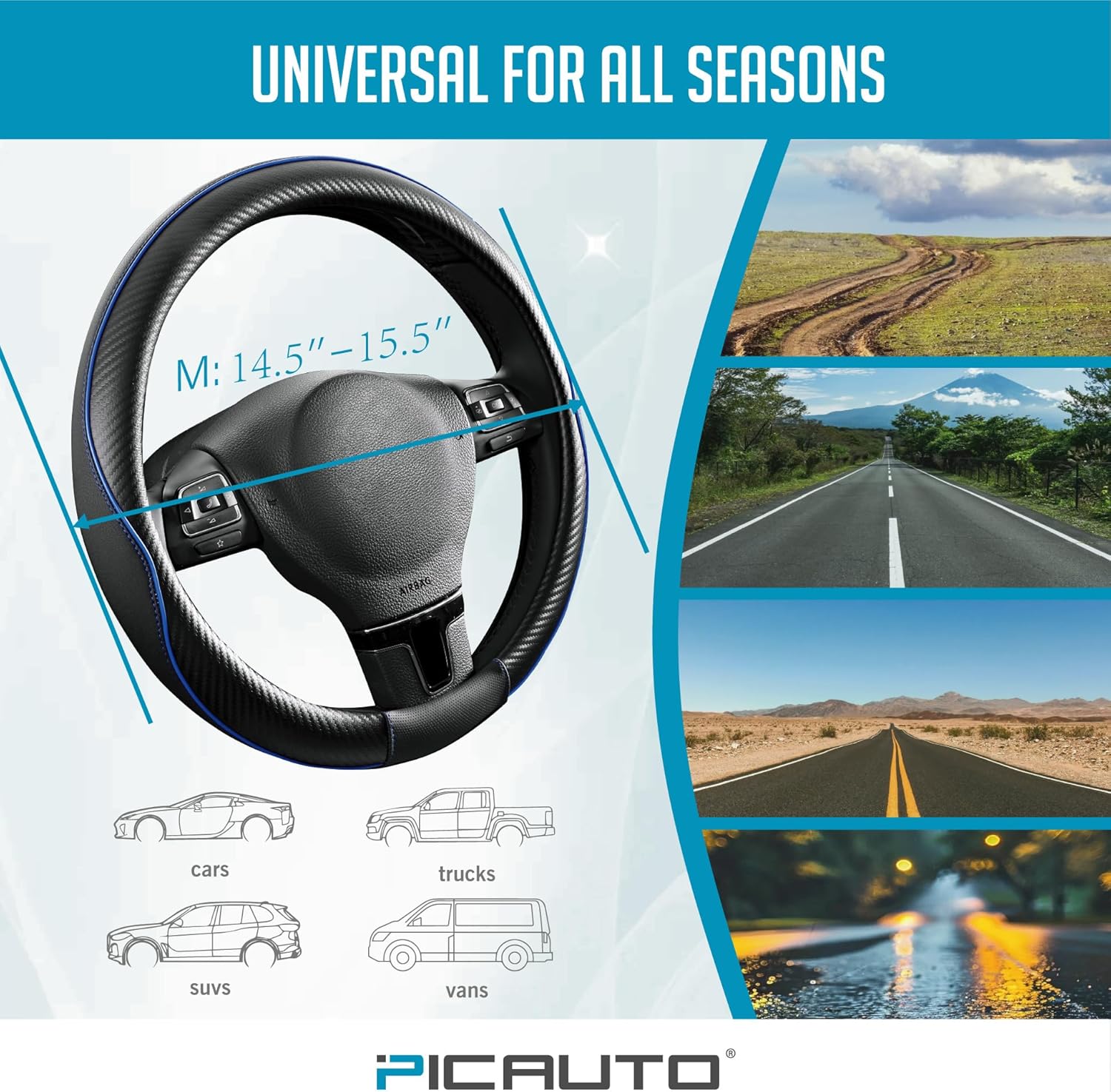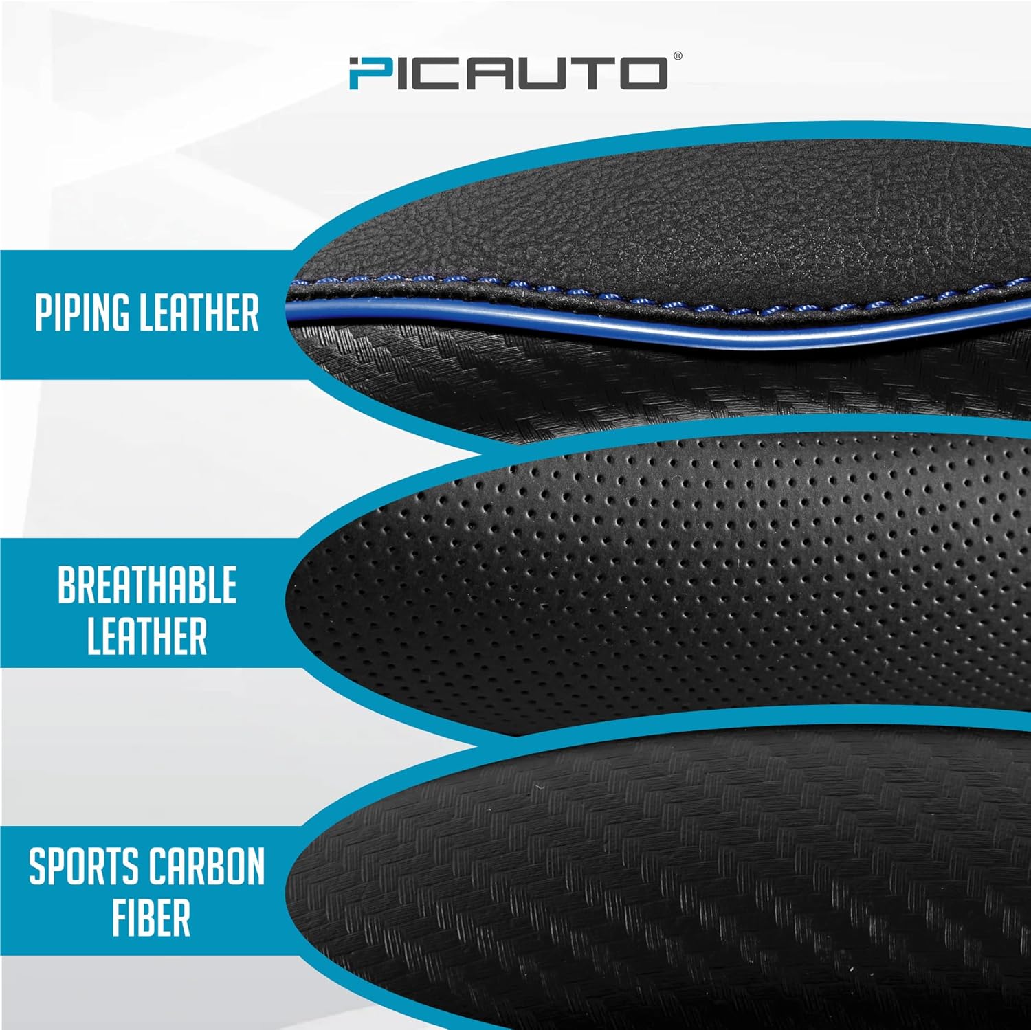 PIC AUTO Steering Wheel Cover, Blue Piping Leather, Sports Carbon Fiber and Super Breathable Leather, Universal 14.5-15.5 Inch Anti-Slip Steering Wheels Accessories for Men & Women