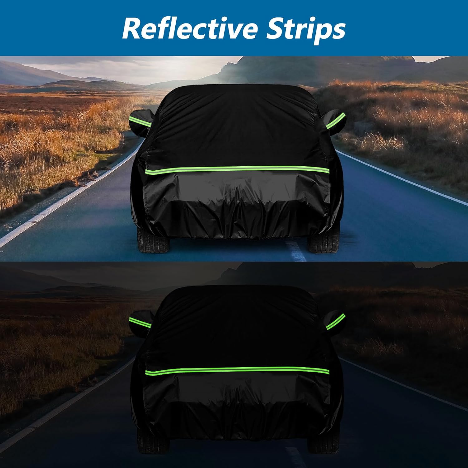 - ăReflective Strips and Driver-Side Zipper Designsă(1) Black Coating: UV protection and heat-proof, prevent cracking and aging of inner decoration leather and plastic. (2)5 Reflective Strips attached on the front DRL lamps, middle Turning lights, and Rear taillight to prevent collisions during the night. (3)It has four straps, a windproof buckle, a security lock, and a storage bag. (4)Mirror Pocket: protect the rearview mirror in all directions. (5) A zipper on the cab side for convenience.