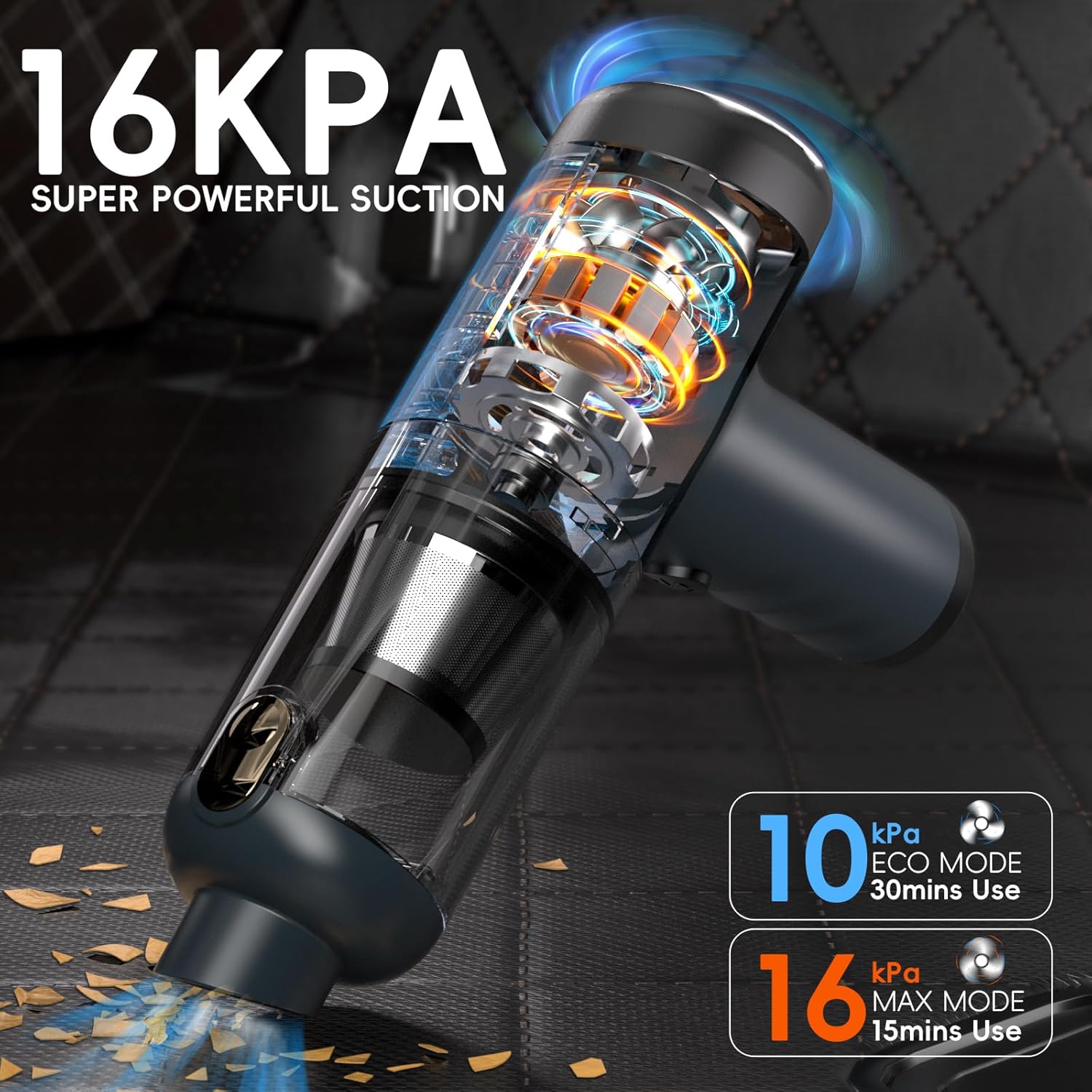 • MAX 16Kpa/120000RPM& 2 MODES: The car vacuum cleaner high power uses a 80W brushless motor that can provide a strong suction force of 16Kpa and 120000RPM high-speed wind force. It provides two cleaning modes: min-10Kpa and max-16Kpa. Switch the suction mode by pressing the switch button, and press the power button for 3 seconds to turn it off.