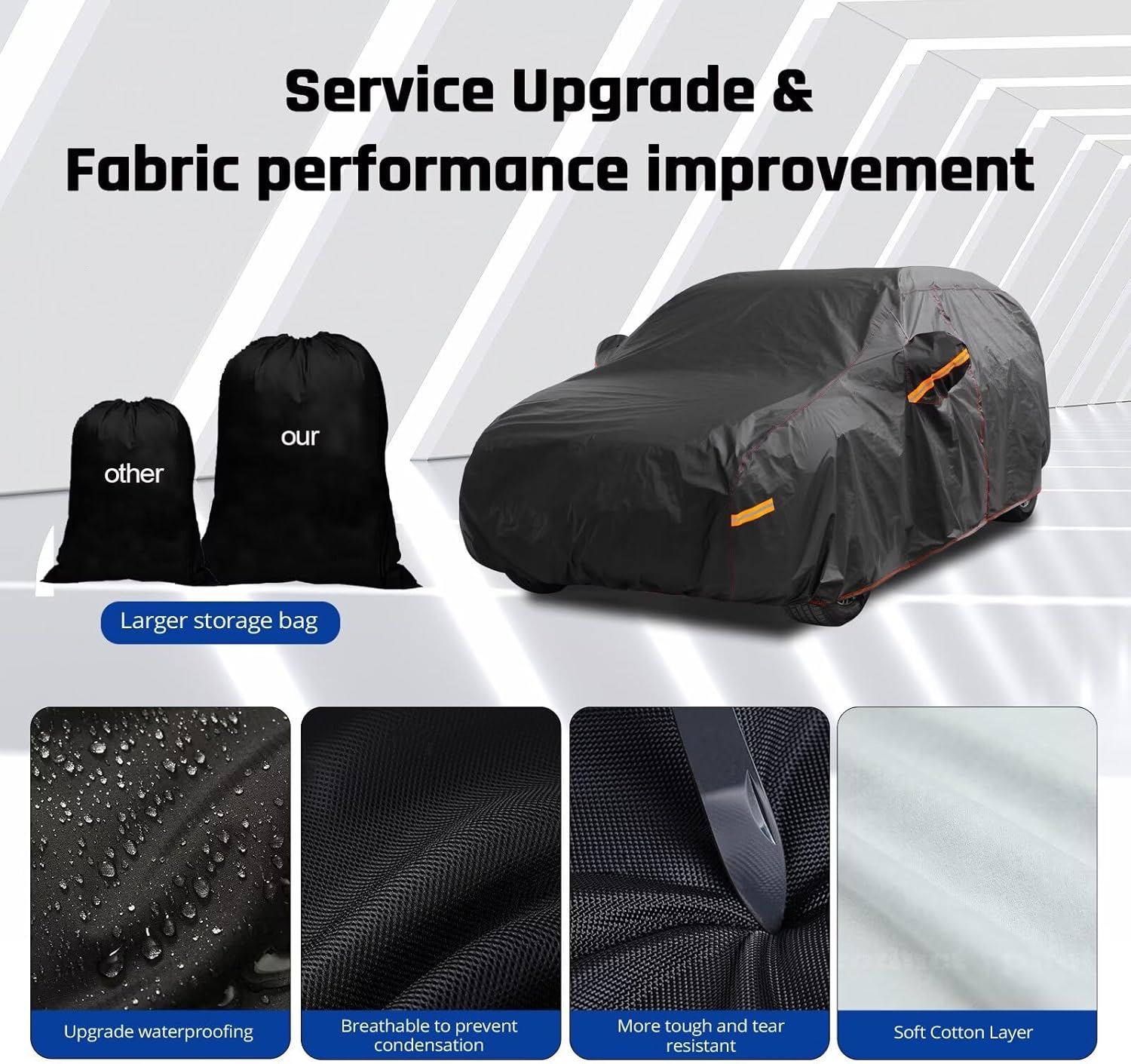 - 【Design Upgrade,Durable Quality】- Professional designers design semi-customized stylish car cover for suv sizes up to 178 inches. (not applicable to Sedans). 1. Mirrored pockets cover all sizes of the range, thickened soft cotton cloth protects the vehicle from painting. 2. Quality upgrade and exquisite craftsmanship make the car cover more durable. 3. The weight is just right and comes with a large storage bag for you to store and carry at any time.
