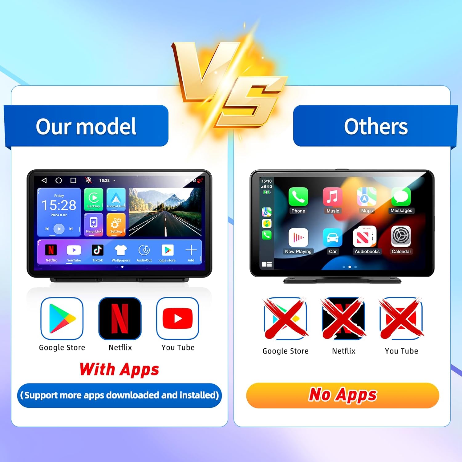 - đźš— POWERFUL ANDROID SYSTEM: Portable Apple Carplay Car Stereo features a powerful Android system, providing smooth and efficient performance. With access to online browsing and the Google Play Store, users can easily download apps, stream content, and enjoy a wide range of entertainment options. Additionally, the system supports offline maps, ensuring reliable navigation even without an internet connection