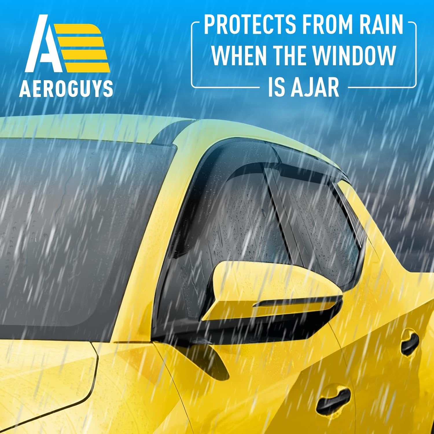 - No Tools Needed, Quick and Easy Assembly β These rain guards are very easy to fit. TAPE-ON INSTALLATION provides perfect fit for your car. Just slip it onto your carβs window and your job is done within minutes. There is no drilling or no tools required. Be sure that AEROGUYS window deflectors are water resistant, sun protective and will not bend, break or crack regardless of the weather conditions.
